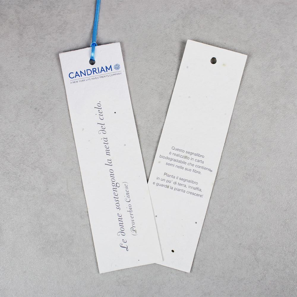 Come main partner di un’evento internazionale dedicato alla parità di genere, Candriam ha voluto omaggiare gli ospiti con un fine SEGNALIBRO in carta semi, sul quale, grazie ad un intervento manuale, è stato ulteriormente aggiunto un richiamo distintivo all’azienda.