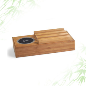 Caricabatterie wireless da 5W che include un supporto per smartphone e tablet integrato. Corpo in legno di bamboo naturale.