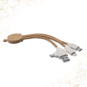 Caricatore in sughero naturale e fibra di grano, connessione micro Usb, tipo C e Lightning. Dimensioni: 5×0.8×16 cm