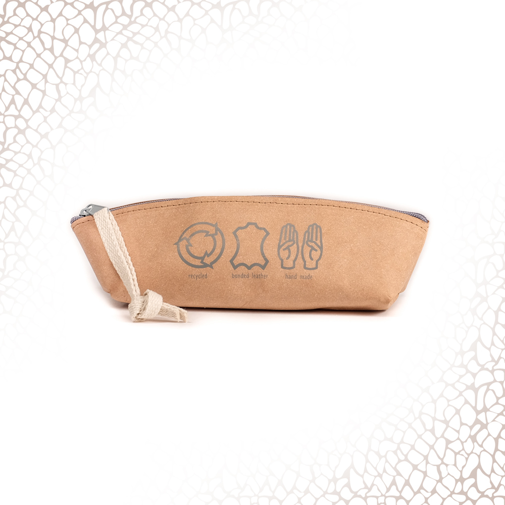 Astuccio portapenne o trucchi in pelle riciclata. Gli scarti di pelle vengono riutilizzati nel ciclo produttivo macinando e poi aggiungendo lattice e grasso naturale come leganti. La pelle riciclata è morbida, piacevole al tatto e ha l’odore della pelle naturale.