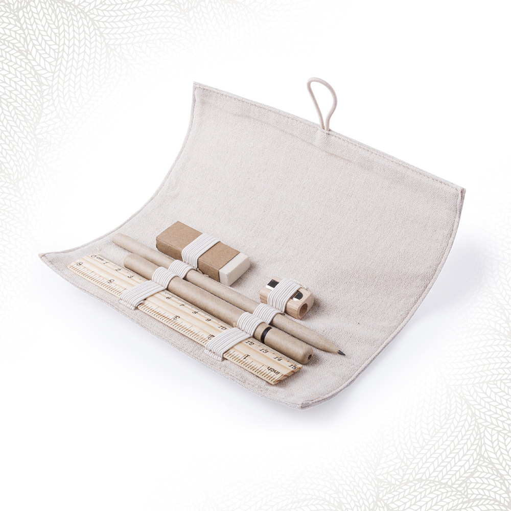 Astuccio in lino con chiusura a gancio su bottone. Contiene righello in legno, matita, penna in cartone riciclato , temperino in legno e gomma con custodia in carta riciclata.