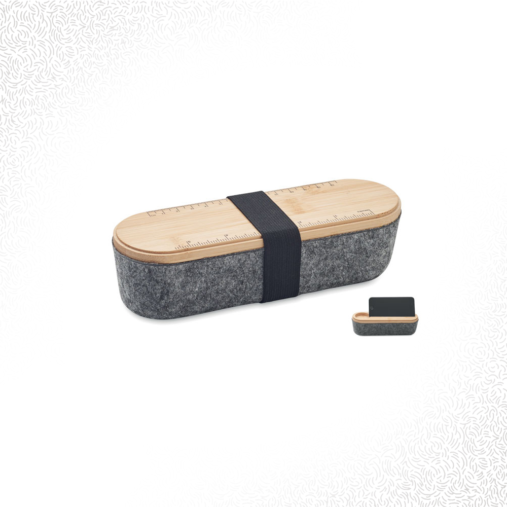 Astuccio in feltro RPET con coperchio in bamboo e portacellulare integrato. Righello: 5,5 pollici e 13,5 cm. Cinghia di chiusura elastica.