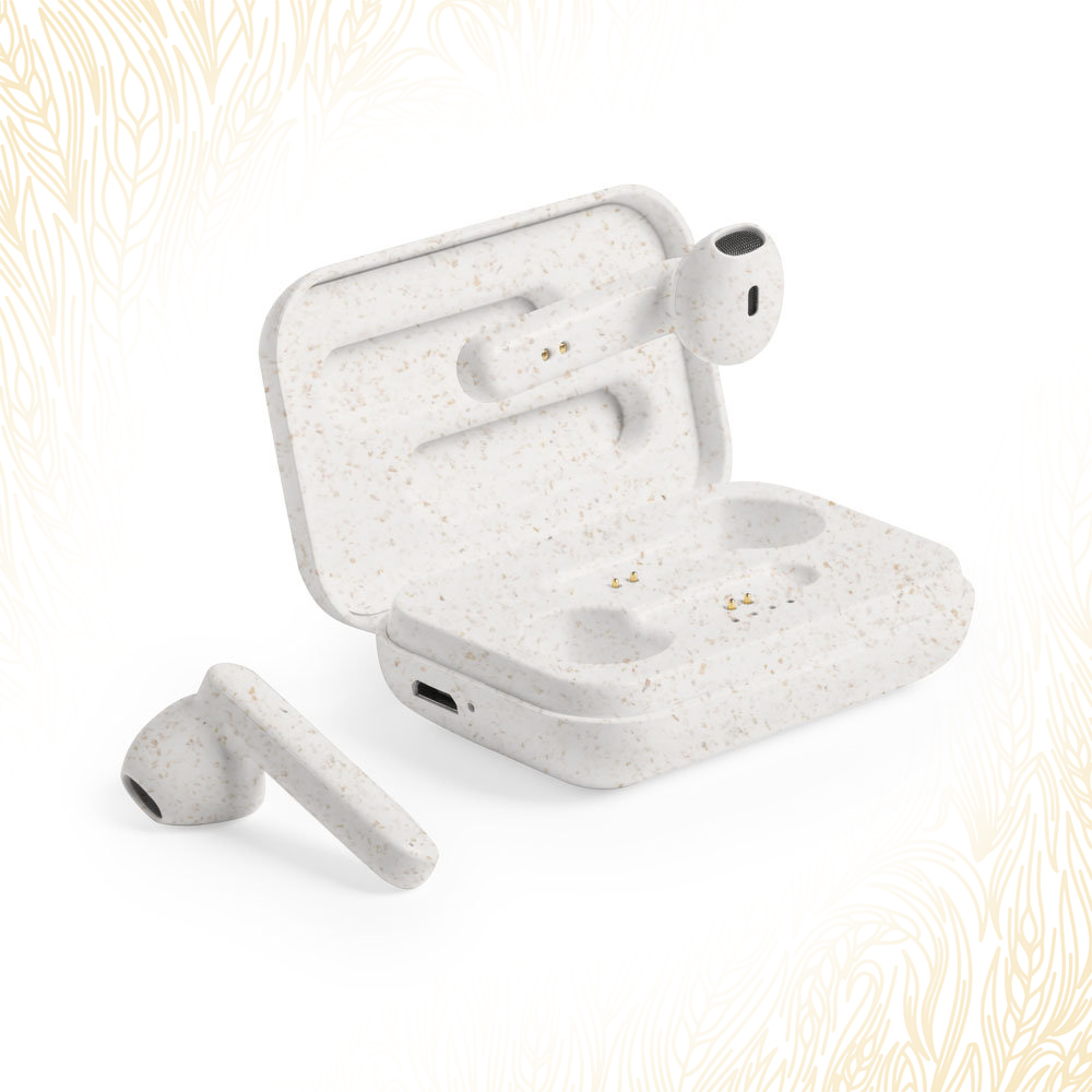 Auricolari in-ear con connessione Bluetooth® 5.0 e custodia in fibra di grano per promuovere l’uso di materie prime naturali e ridurre le emissioni inquinanti.Dal design ergonomico, dotato di pulsante di controllo tattile integrato nell’auricolare, con base di ricarica abbinata e luce di stato di ricarica a LED. Vivavoce con cavo micro USB incluso.