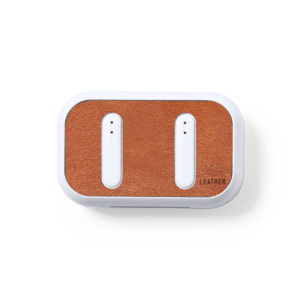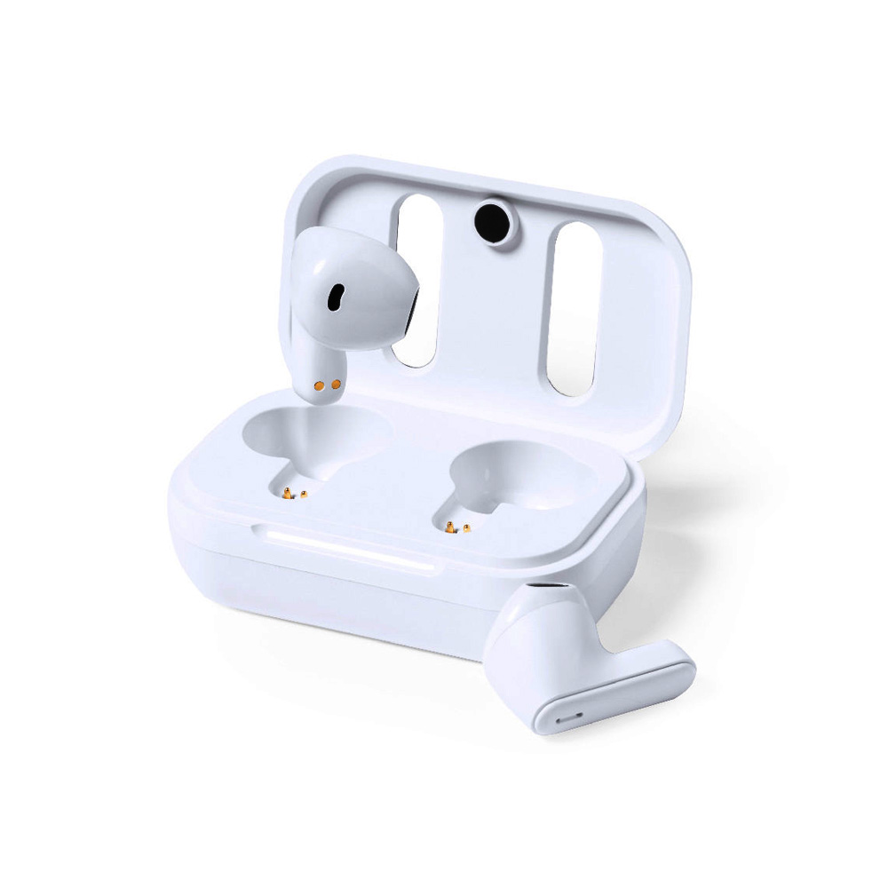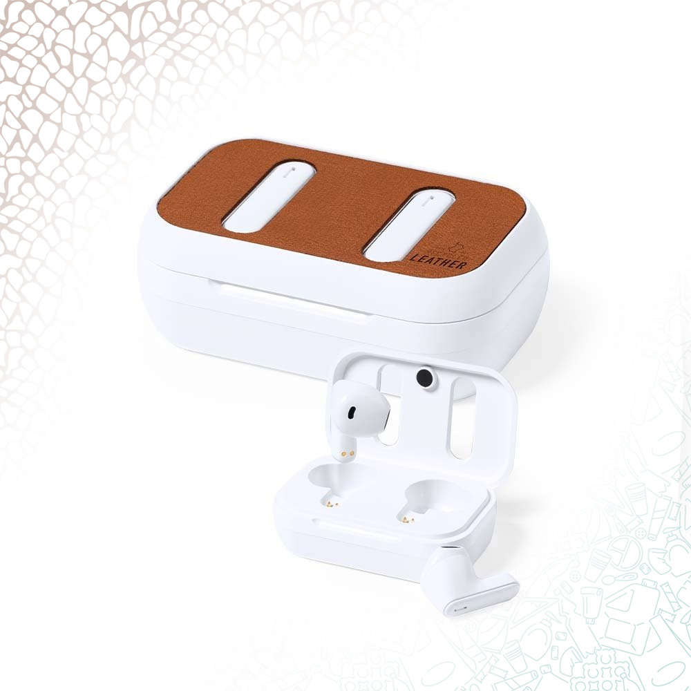 Auricolari in plastica riciclata e pelle riciclata, con connessione bluetooth, batteria 30mAh. Base di ricarica 300 mAh.