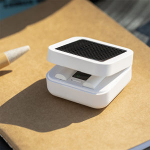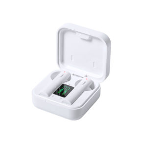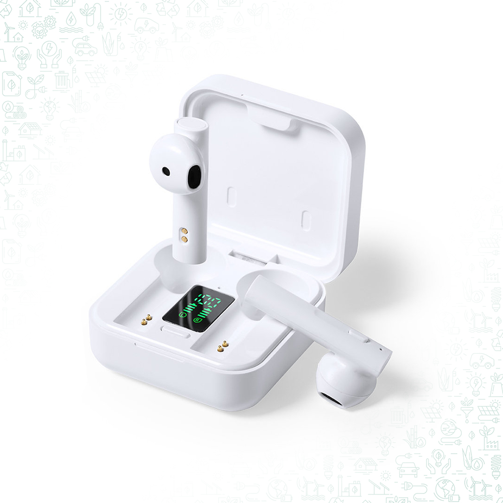 Cuffie in-ear con elegante finitura bianca e connessione Bluetooth® 5.0. Con pannello solare di ricarica integrato nel coperchio e display LCD interno con indicatore dello stato di carica. Design ergonomico, con pulsante di controllo integrato sull’auricolare, e base abbinata.
