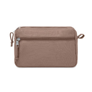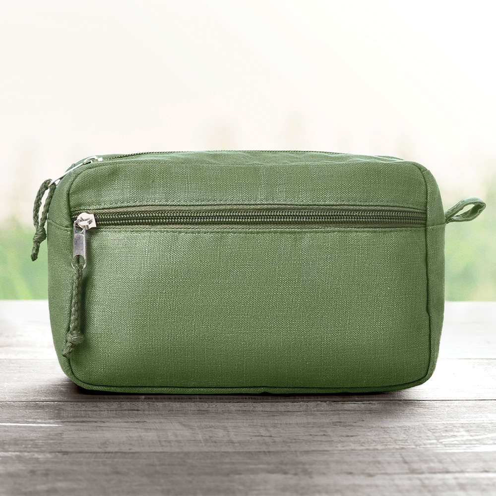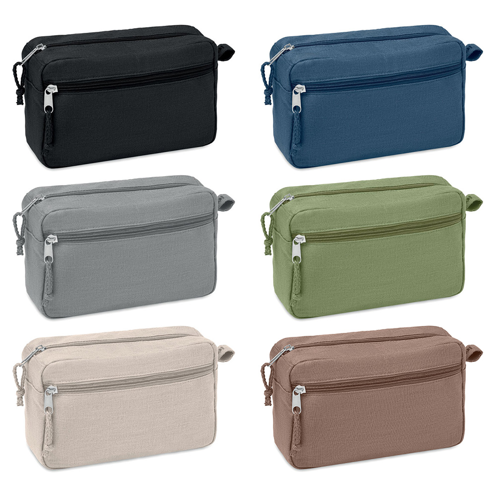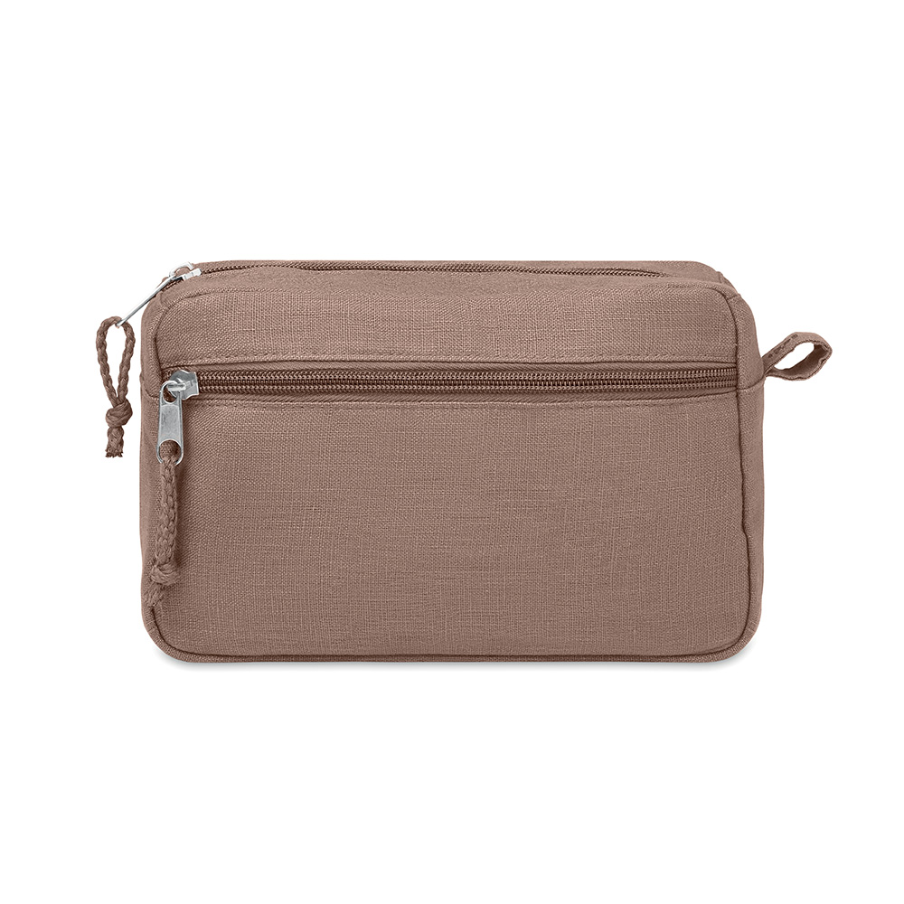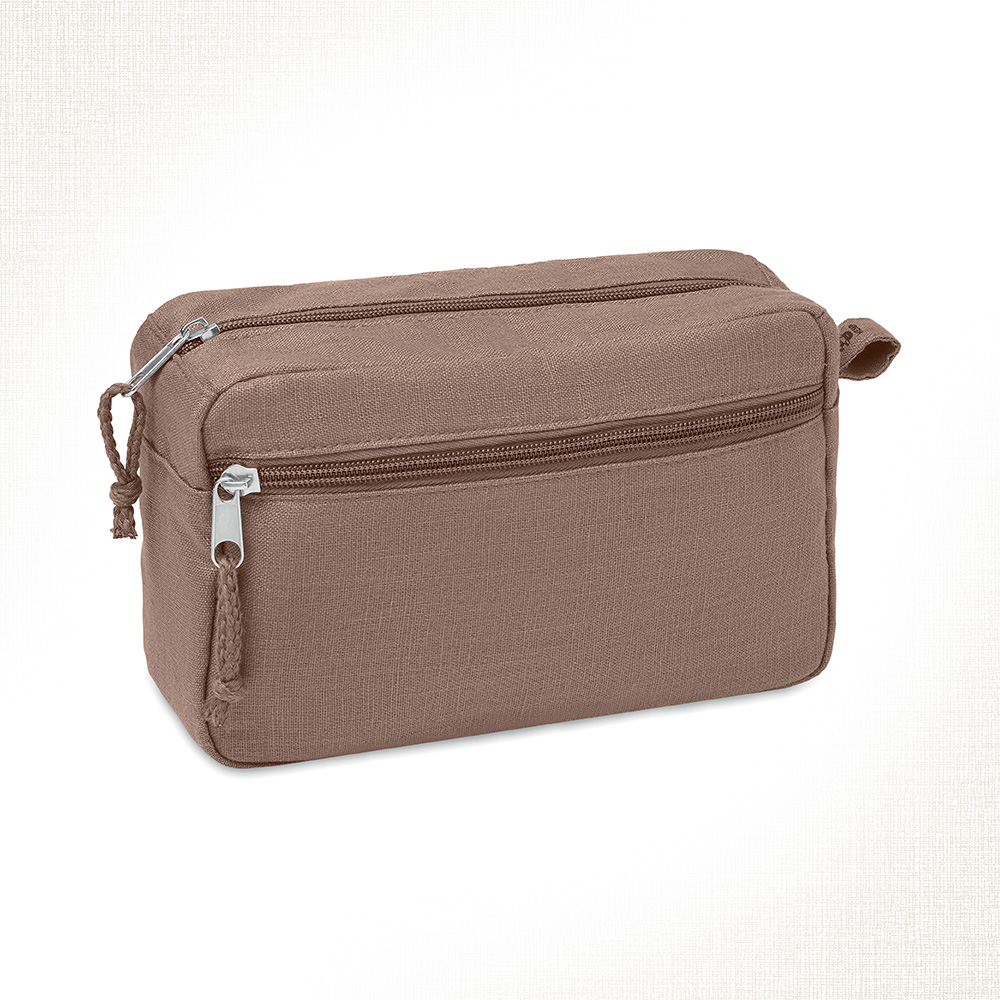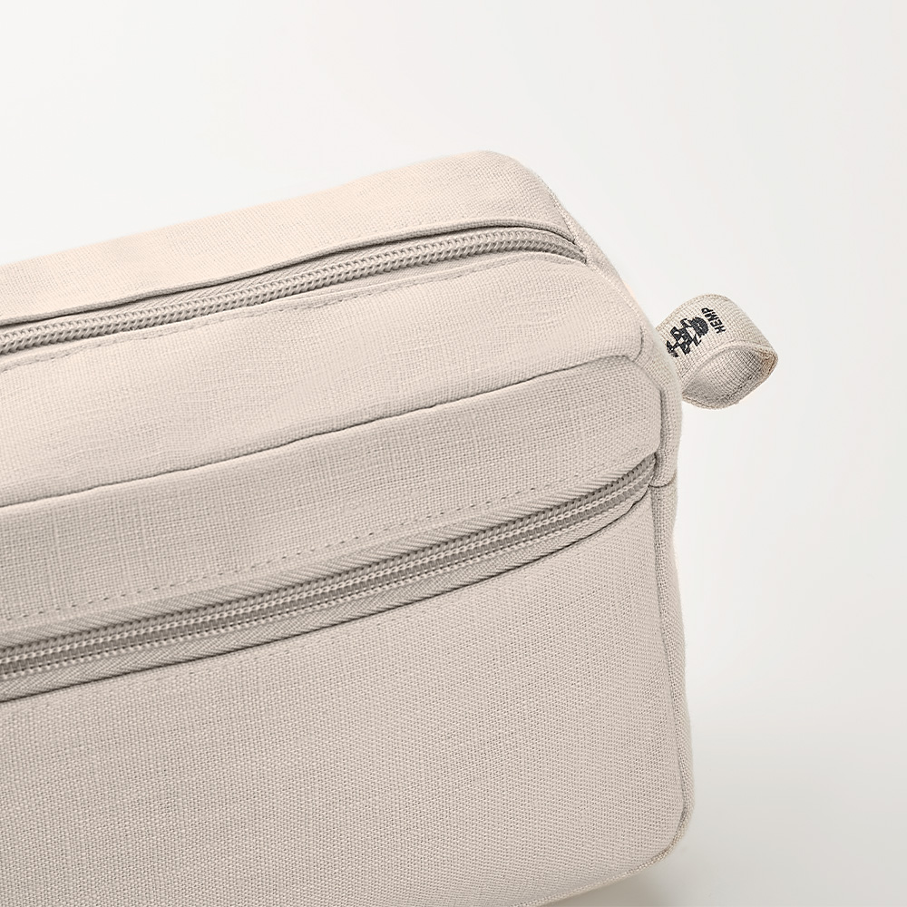 Questa trousse con doppia cerniera è perfetta da portare in viaggio. Realizzata in canapa 100%, durevole e sostenibile. Potrete riporvi tutti i cosmetici, i flaconi di shampoo e trucchi nello scomparto principale, la tasca frontale invece può essere riempita con oggetti più piccoli e può essere appesa grazie al comodo passante. 200 gr/m².