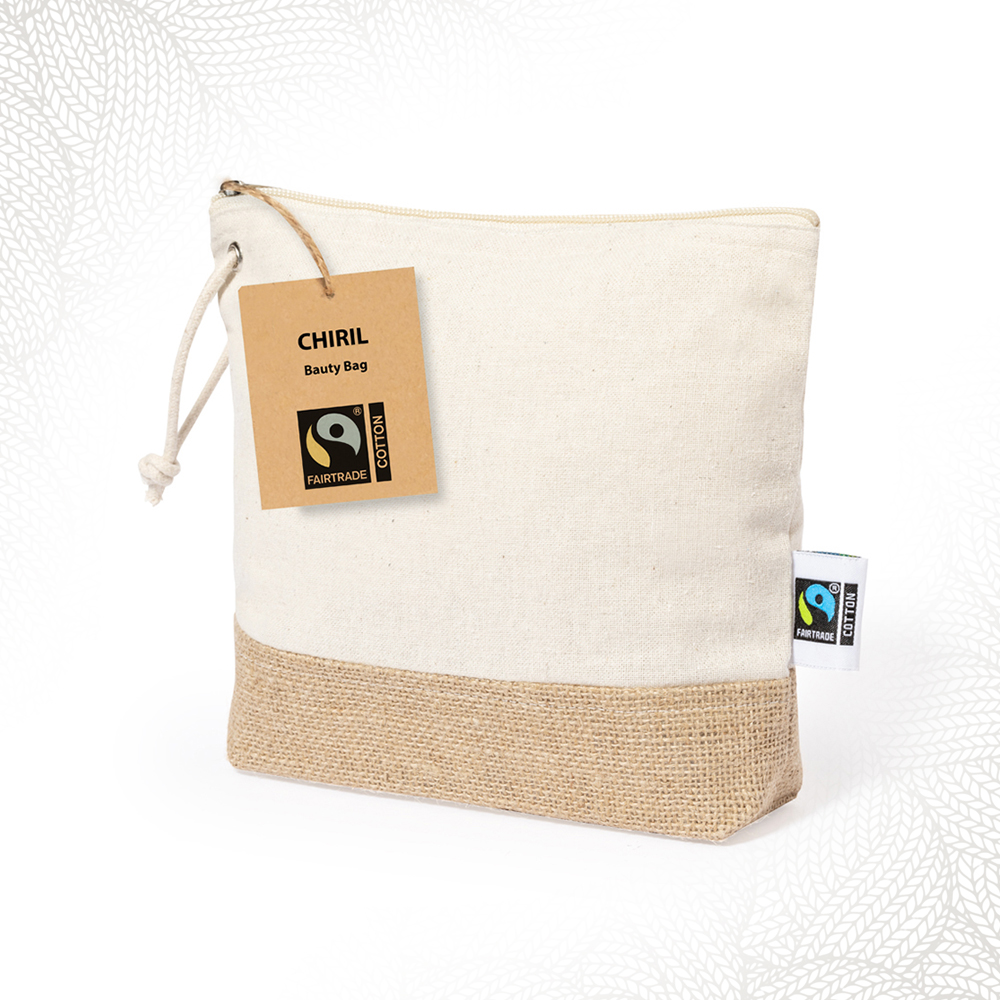 Beauty Case della linea natura, realizzato in 100% cotone e juta laminata. Certificata Fairtrade, un sistema di commercio solidale e alternativo al commercio convenzionale che persegue lo sviluppo dei popoli e la lotta alla povertà. Scomparto principale con chiusura a zip e tiretto in metallo, con base in juta naturale e parte anteriore superiore disponibile in cotone naturale. Con pratica coulisse in un angolo per facilitare il trasporto. Etichetta Fairtrade e targhetta con logo su cartone riciclato incluse