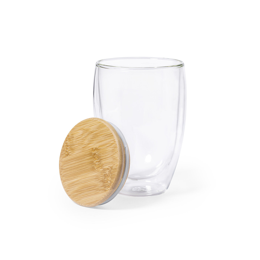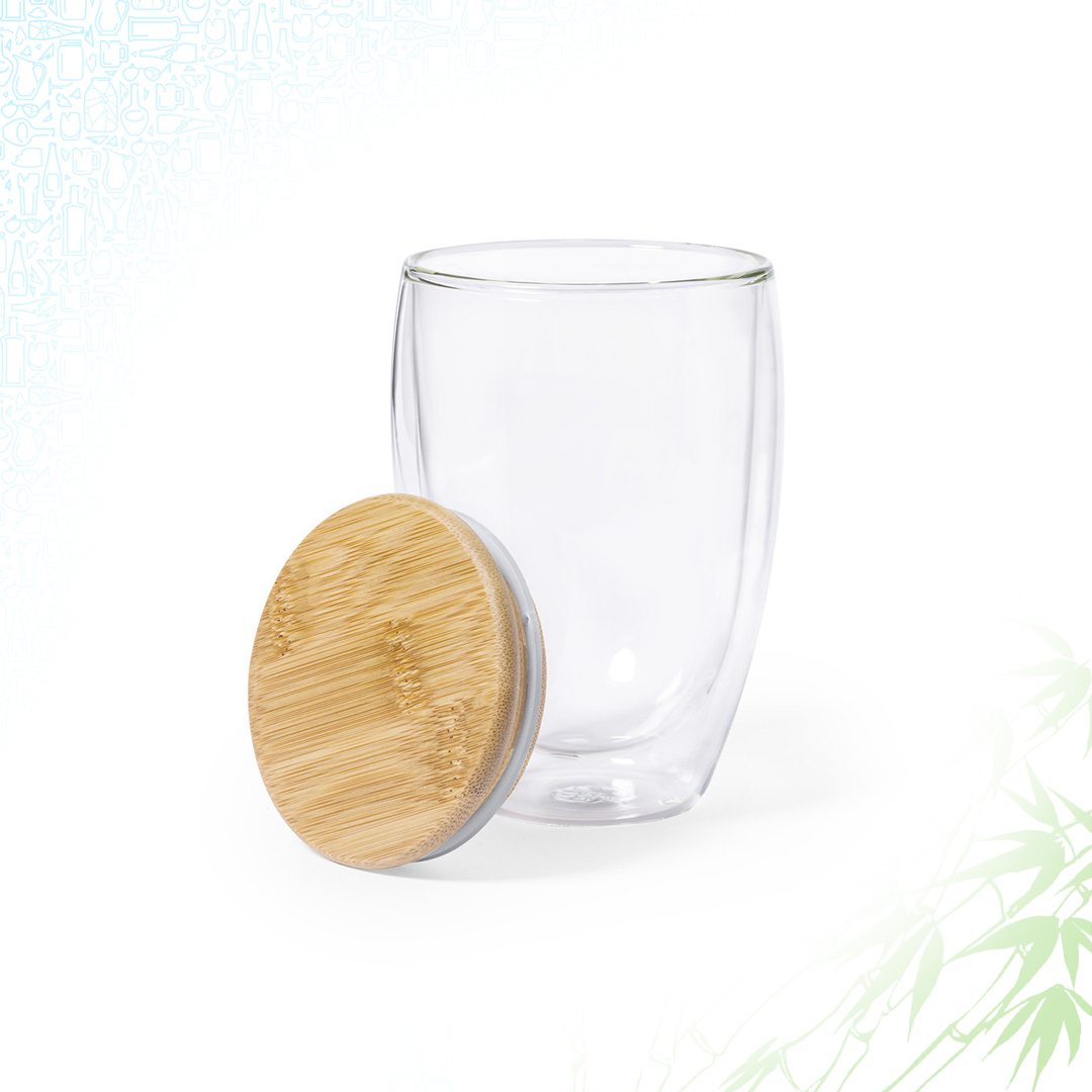 Bicchiere termico di alta qualità della linea natura, a doppia parete e con capacità di 350ml. Realizzato in vetro borosilicato, che offre una resistenza e una durata eccezionali, estendendo la sua vita utile e può essere riutilizzato innumerevoli volte. Coperchio in bambù. Confezionato in un’attraente scatola di eco-design.