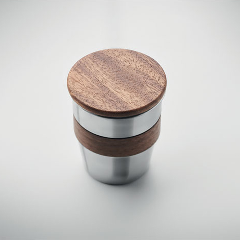 Bicchiere monostrato in acciaio inox riciclato (90% acciaio inox riciclato e 10% acciaio inox) con impugnatura e coperchio wallnut. Capacità: 350 ml. Rimuovere l’impugnatura per la pulizia