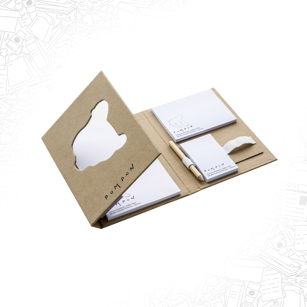 Blocchetto per appunti con copertina rigida e possibilità di sagomare a piacere il proprio logo. foglietti e index per poter appuntarsi qualsiasi messaggio, portapenne.