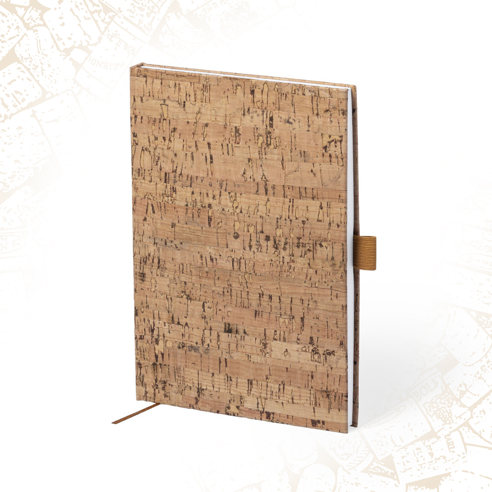 Block notes che presenta la copertina rigida in sughero naturale, dal design sobrio. Include 100 fogli bianchi lisci, con un segnalibro e un portapenne abbinato.