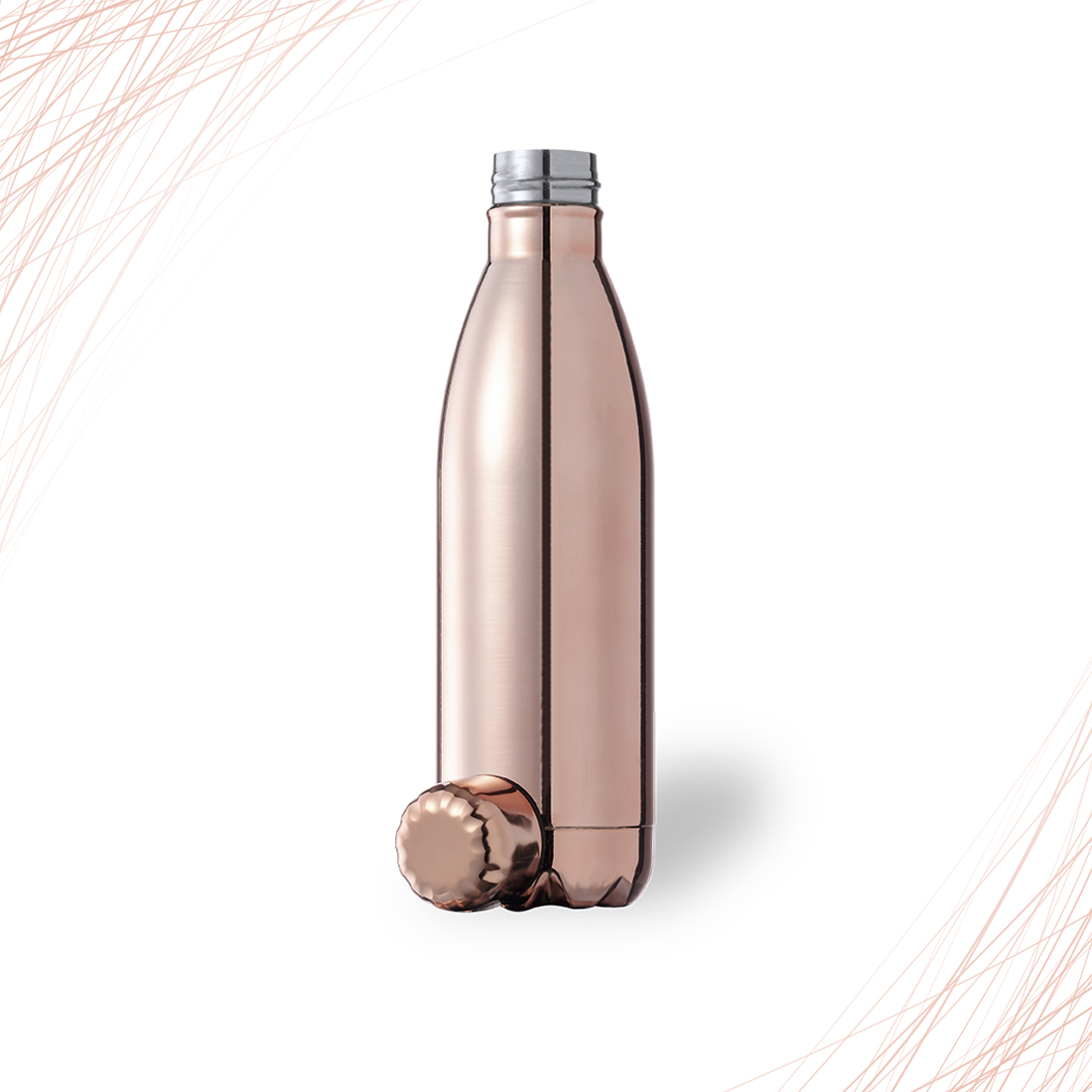 Borraccia da 790 ml, in acciaio inox con rivestimento esterno in rame galvanizzato. Tappo a vite, senza BPA. Presentata in una scatola nera individuale dal design elegante.