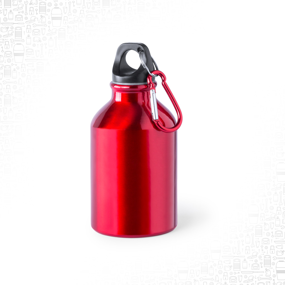 Borraccia da 330 ml in alluminio con rifinitura lucida. Tappo di sicurezza avvitabile e moschettone in metallo. Confezionata singolarmente in scatola illustrata. Dimensione: 15cm