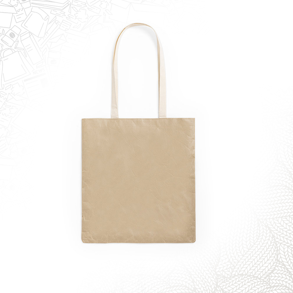 Shopper in carta laminata da 105g/m2, altamente resistente. Manici lunghi in cotone di colore naturale.Finitura cucita e resistenza fino a 8 kg di peso. Dimensioni: 37×41 cm