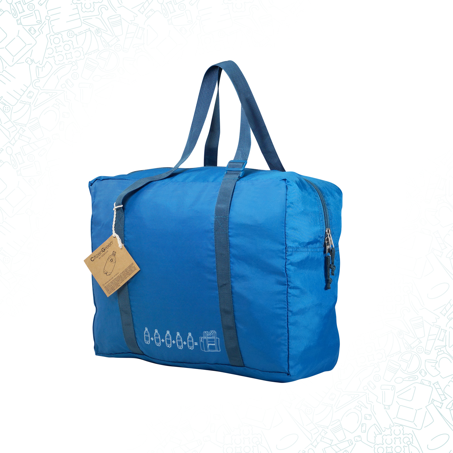 Borsa da viaggio pieghevole nella tasca frontale + moschettone. Dimensioni 42 x 34 x 16 cm. Materiale 100% RPET.