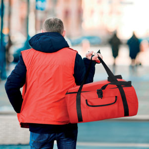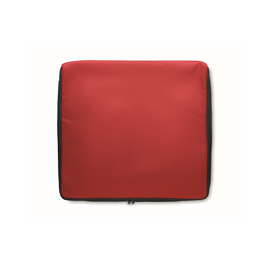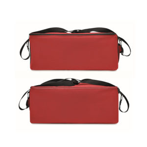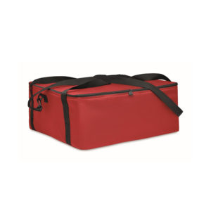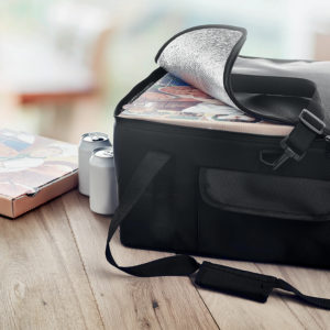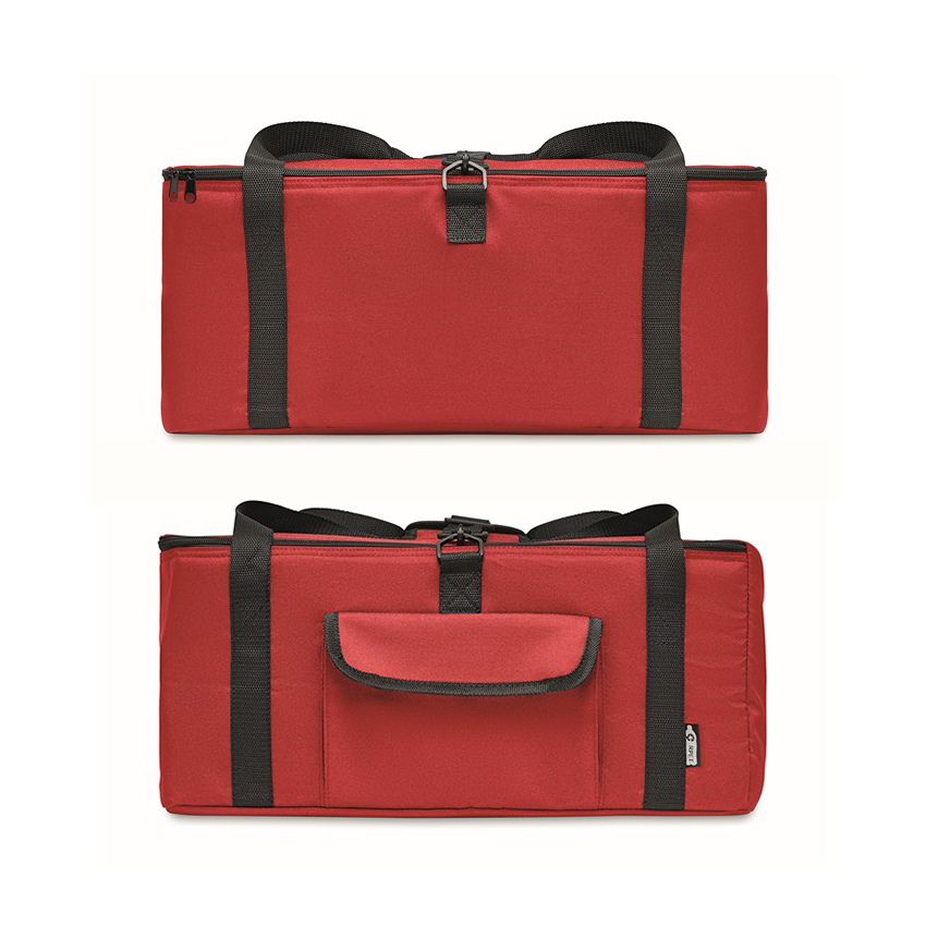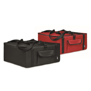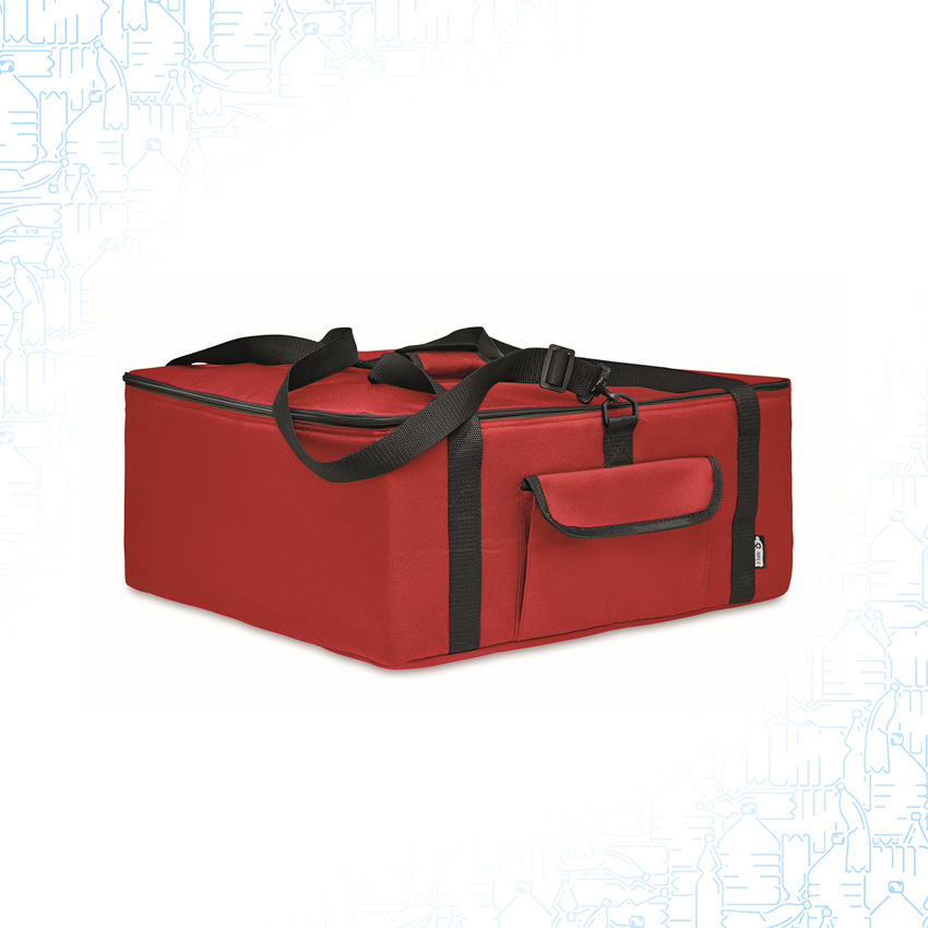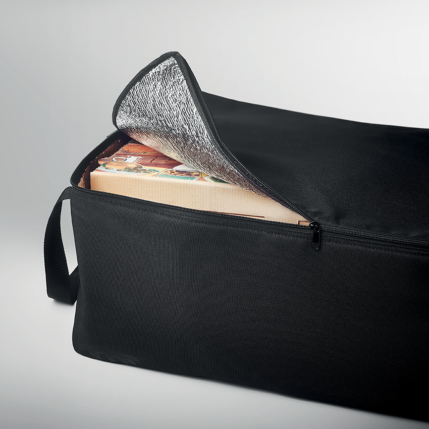 Borsa termica per consegna pizza in 600D RPET con 1 tracolla lunga regolabile e 2 manici laterali. Questa scatola isolata mantiene le pizze calde. Realizzata in plastica PET riciclata, ha un rivestimento in PU con finitura impermeabile. Materiale isolante: foglio di alluminio + schiuma da 6 mm.