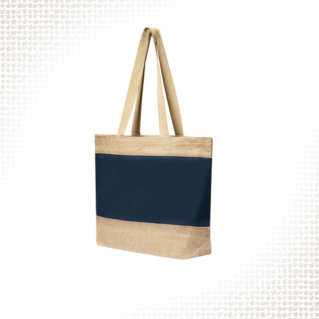 Borsa prodotta con una robusta combinazione di juta laminata e cotone laminato, con manici in cotone naturale. Finitura cucita, con lunghe maniglie rinforzate e disponibile in una vasta gamma di colori. Resistenza fino a 10 kg di peso.