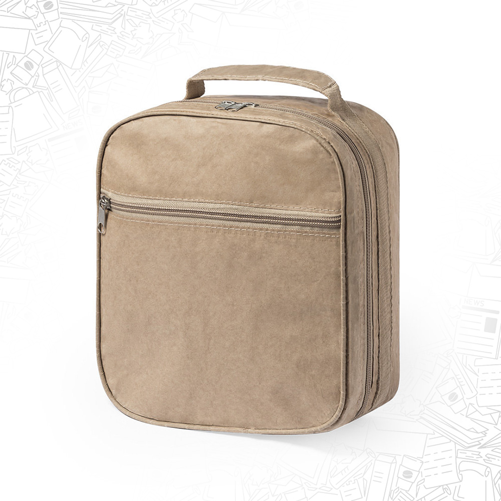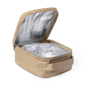 Borsa termica fatta in carta riciclata. Con due scomparti indipendenti con cerniera e tiretti in metallo. Maniglia di trasporto rinforzata e interno in alluminio isotermico