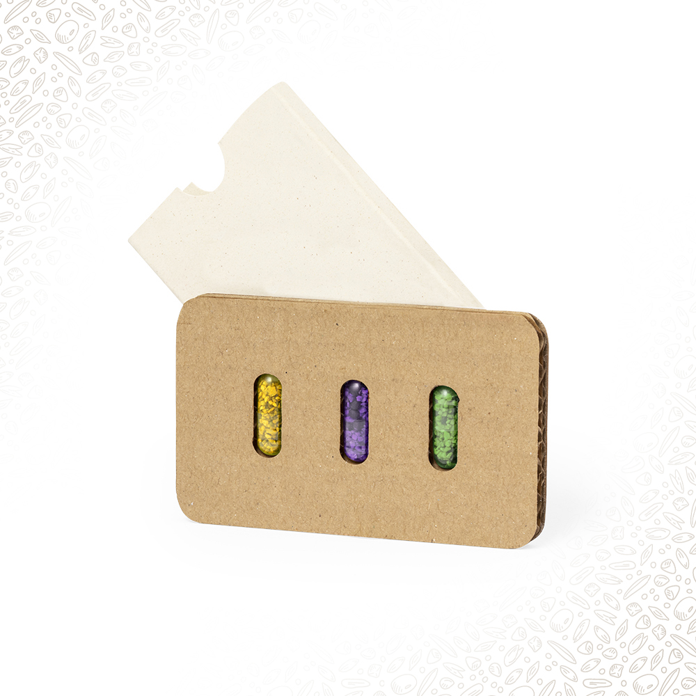 Set di capsule con semi presentato in una custodia di cartone riciclato fustellato con istruzioni per la semina. Questo kit da giardino contiene semi di lavanda, finocchio e aneto. 3 Pezzi