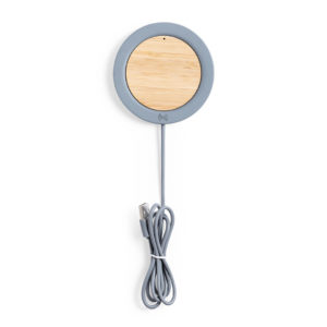 Caricabatterie wireless dal design circolare in bambù naturale e pietra cemento, un legante formato da una miscela di materiali naturali, principalmente calcare macinato e acqua, da cui si ottiene un materiale di grande consistenza e durata. Indicatore LED, cavo di ricarica USB abbinato.