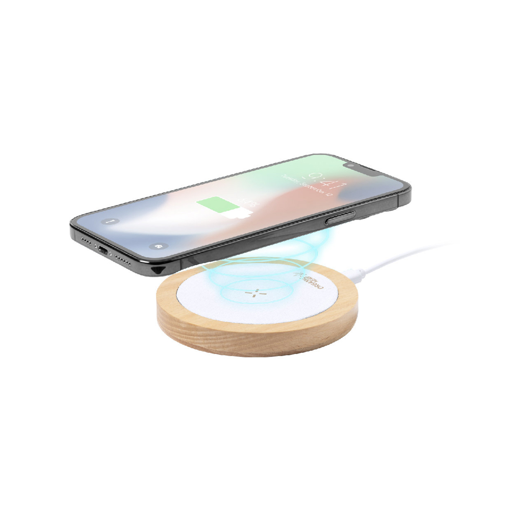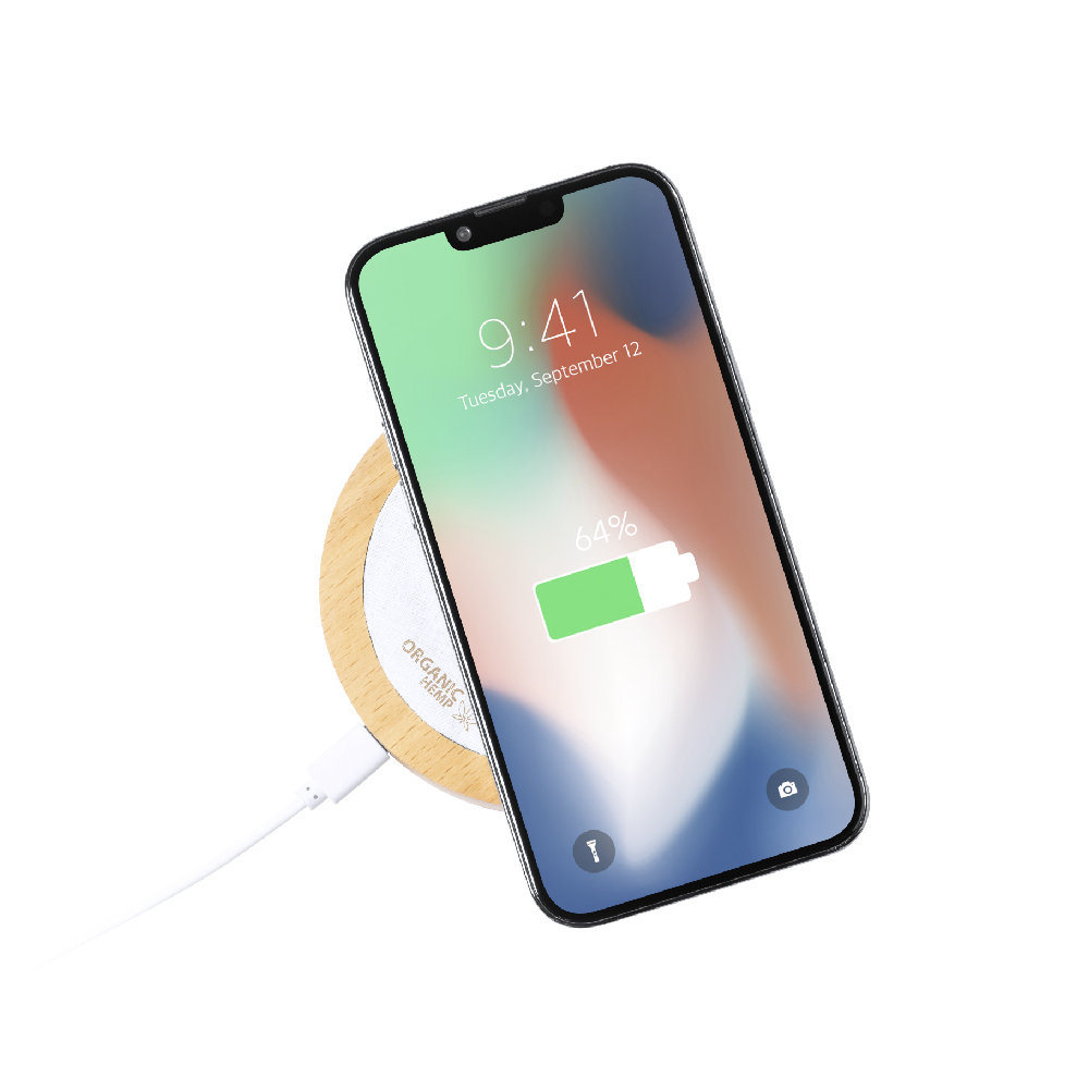 Caricatore wireless fatto con parti in legno e canapa organica.