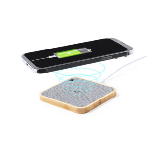 caricatore wireless fatto con parti in Rpet e parti in bamboo. potenza di ricarica 15W. Per ricaricare i tuoi cellulari in ufficio e a casa