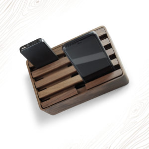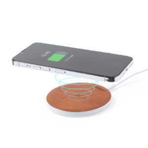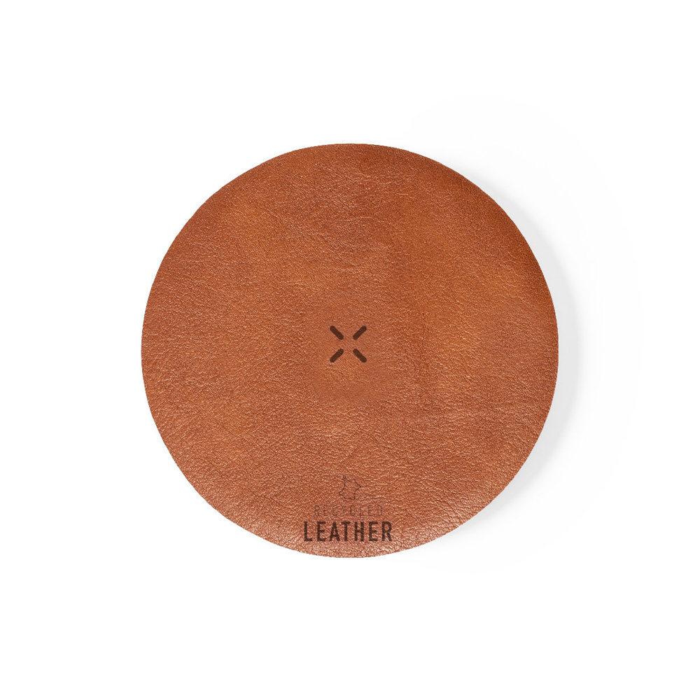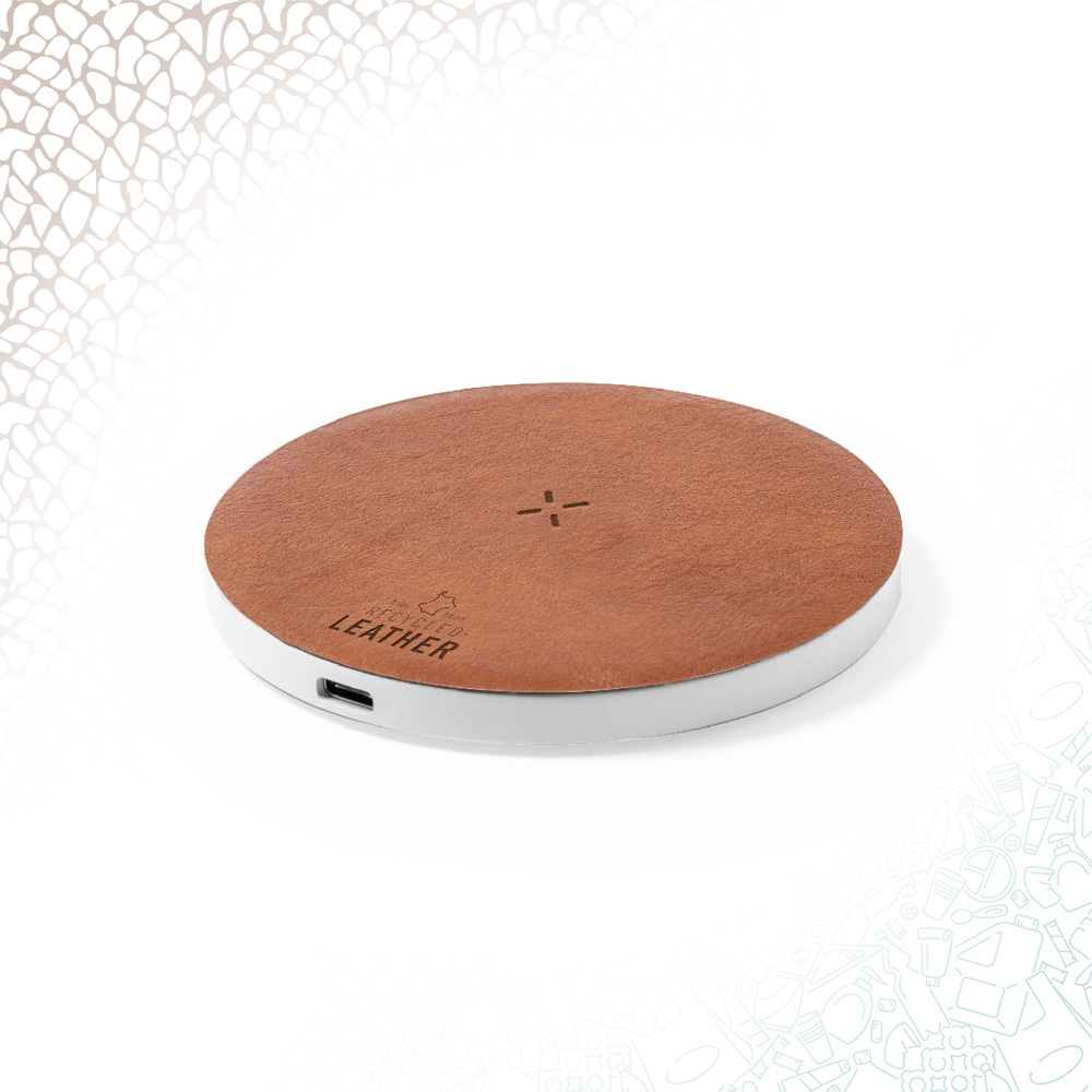Caricatore wireless fatto con parti in plastica riciclata e parti in pelle riciclata. Potenza di ricarica 15W. Per ricaricare i tuoi cellulari in ufficio e a casa senza bisogno di cavi