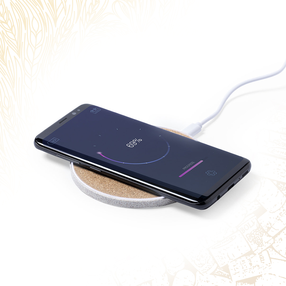 Caricatore wireless da 5W a forma circolare.Struttura realizzata in una combinazione di sughero naturale e fibra di grano.Include un cavo micro USB lungo 1 metro con indicatore dello stato di carica e compatibile con i dispositivi dotati di tecnologia di ricarica senza fili.