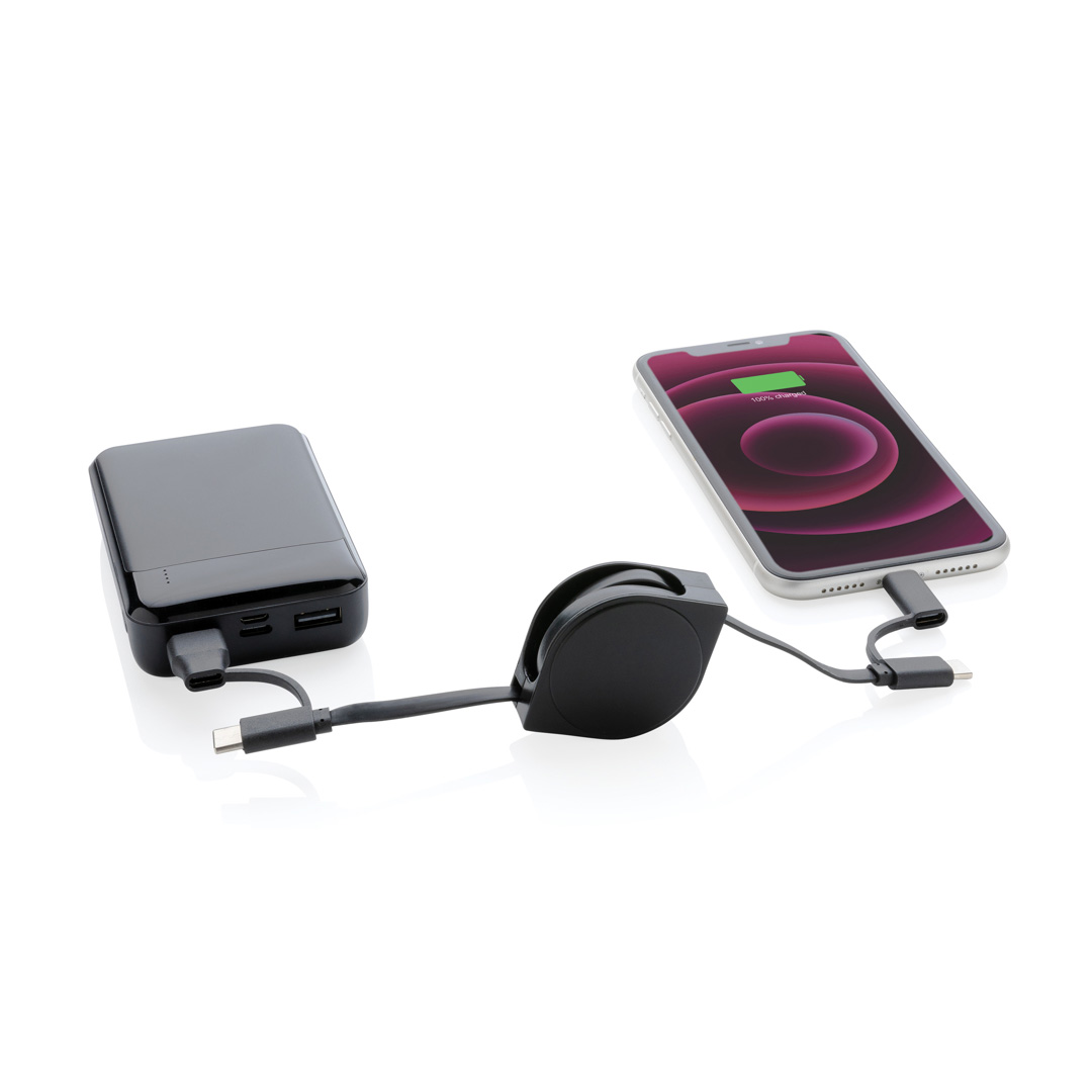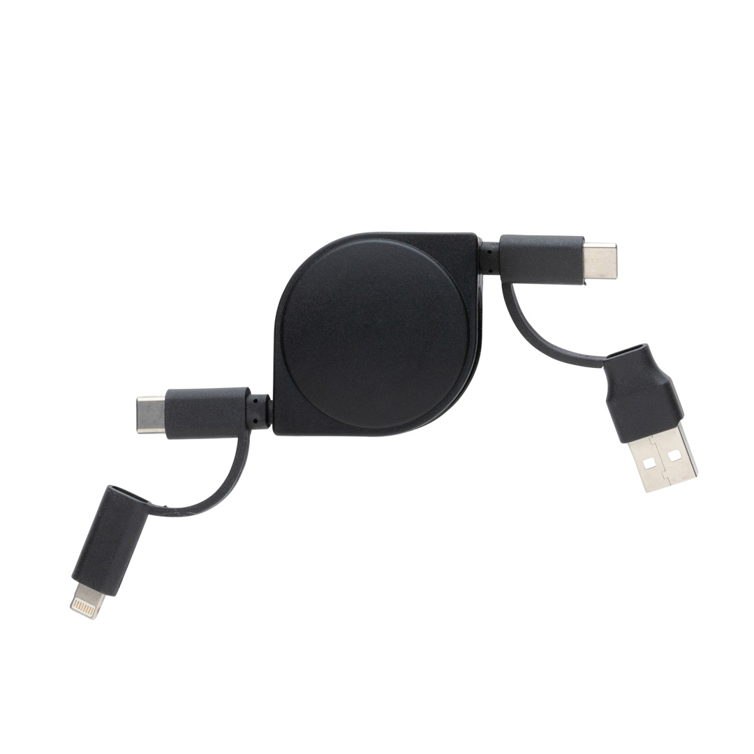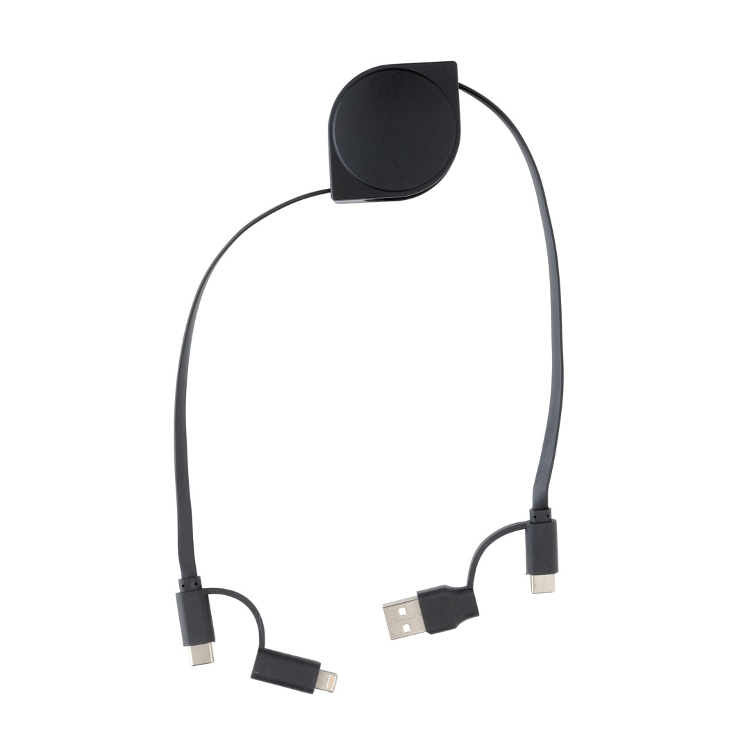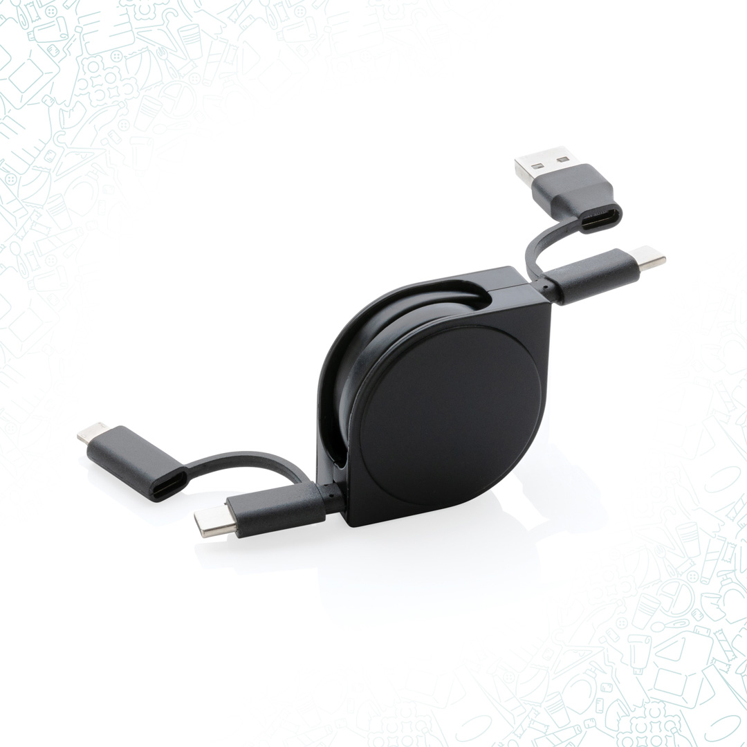 Cavo retrattile 6 in 1 con custodia in plastica ABS riciclata certificata RCS e filo in TPE riciclato. RCS (Recycled Claim Standard) è lo standard che viene utilizzato quando una parte dell’articolo è stata realizzata con materiali riciclati.