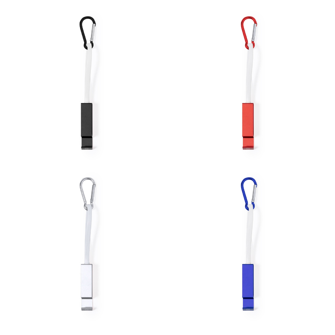 Cavo di ricarica multifunzionale, realizzato in Alluminio Riciclato con un design ingegnoso che consente di riporre comodamente i cavi di ricarica e di trasportarli facilmente. Include un moschettone e un supporto per smartphone coordinati, con connessione di tipo C (ingresso e uscita) e doppia Micro USB / Lightning. In vari colori con finitura metallica e logo Recycled Aluminium. Presentato in una borsa riciclata individuale.