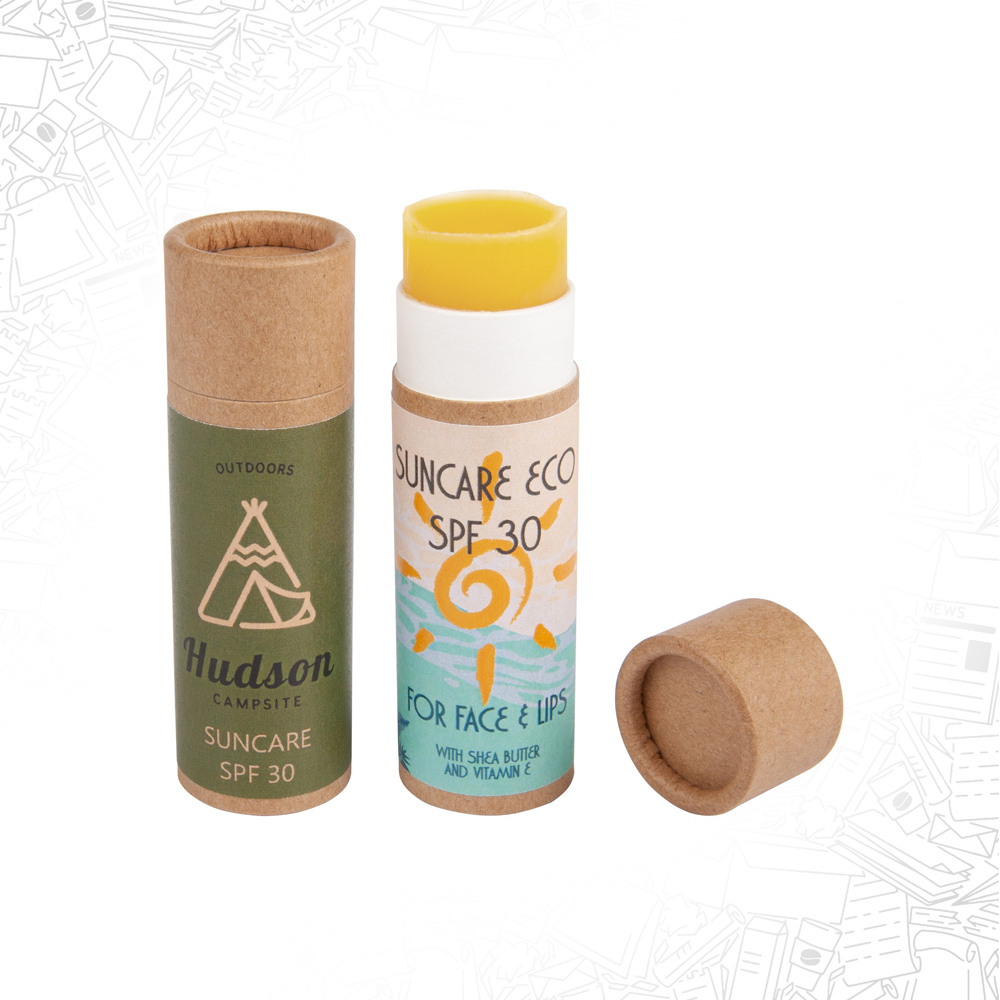 Protezione solare con SPF 30 per viso e labbra in contenitore push-up ecologico in cartone certificato FSC. Il tubetto ecologico e vegano non contiene plastica, è compostabile ed è rifinito con etichetta in carta 4 colori