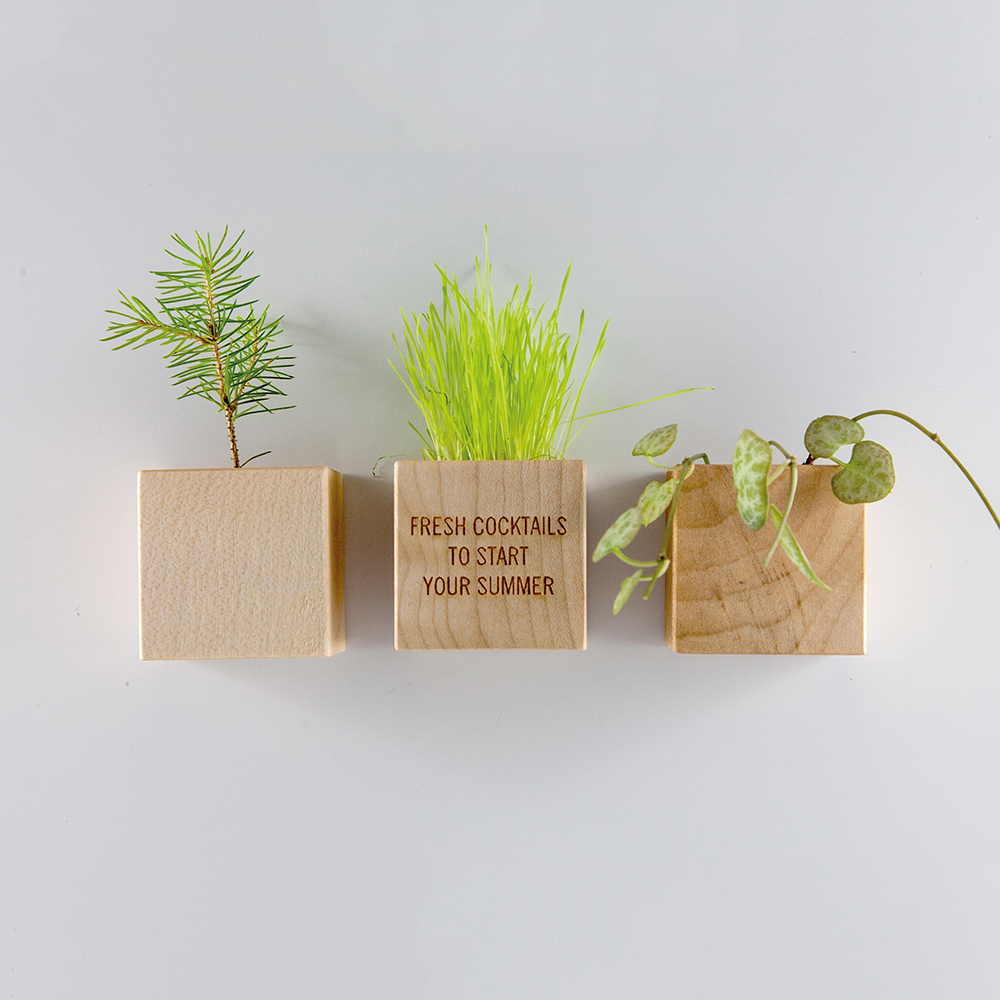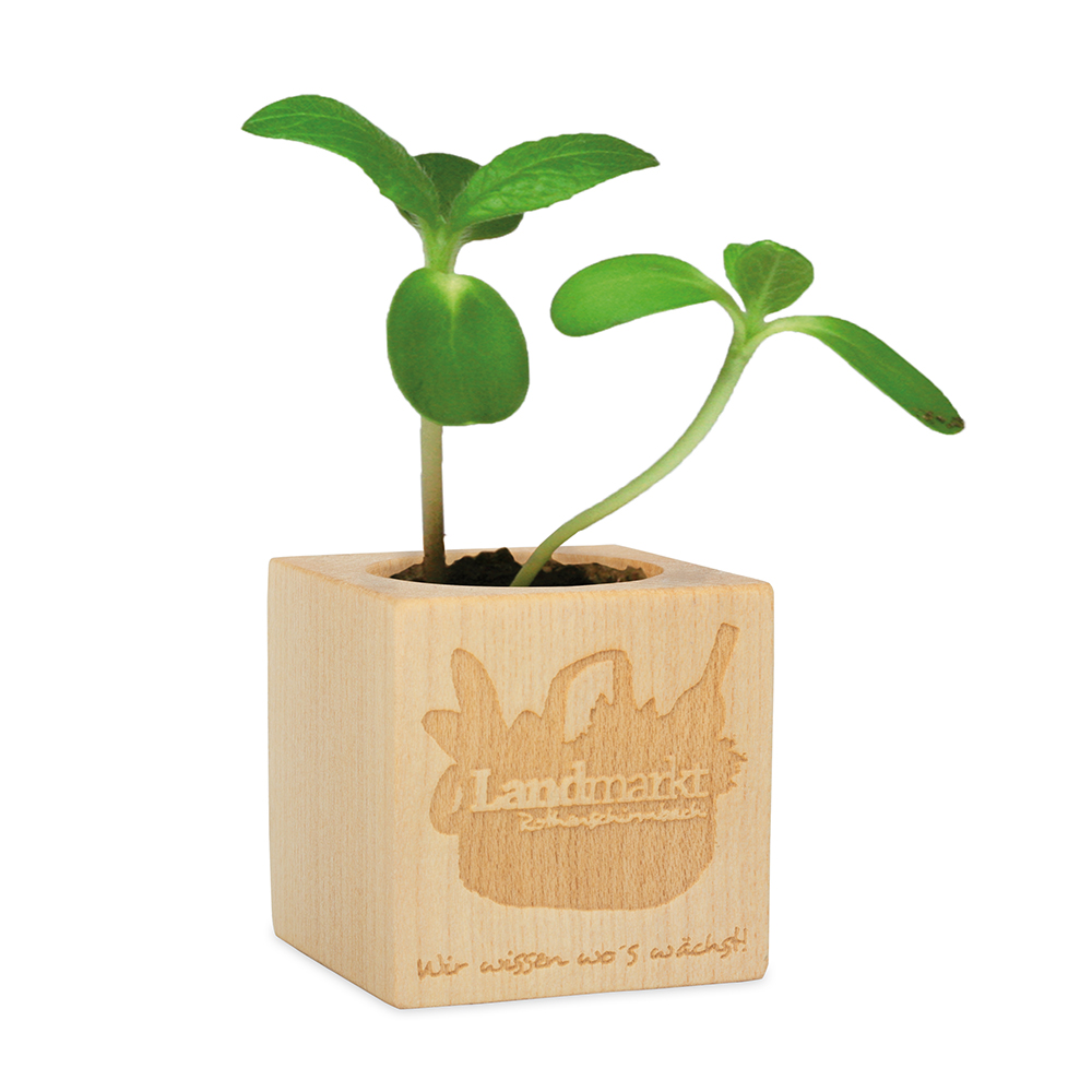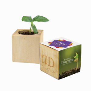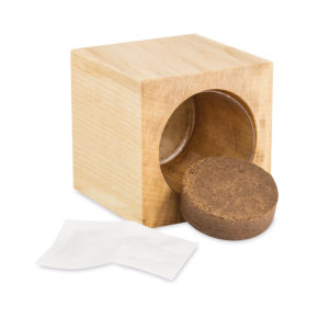 Cubo di legno contenente torba e semi. Il prodotto, disponibile in varie dimensioni, viene fornito con un disco di torba e una bustina coi semi che preferisci, per poter far crescere la tua pianta nel luogo a te più congeniale.