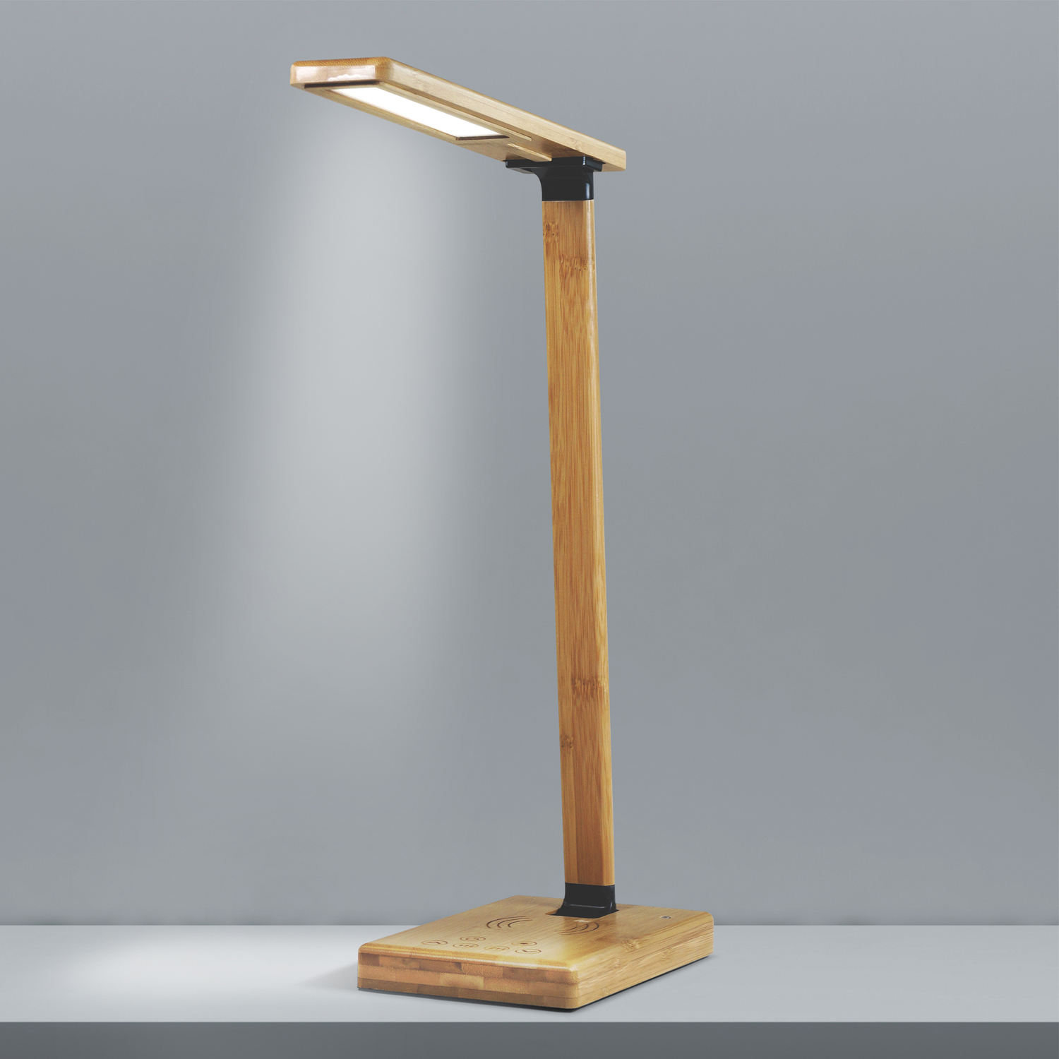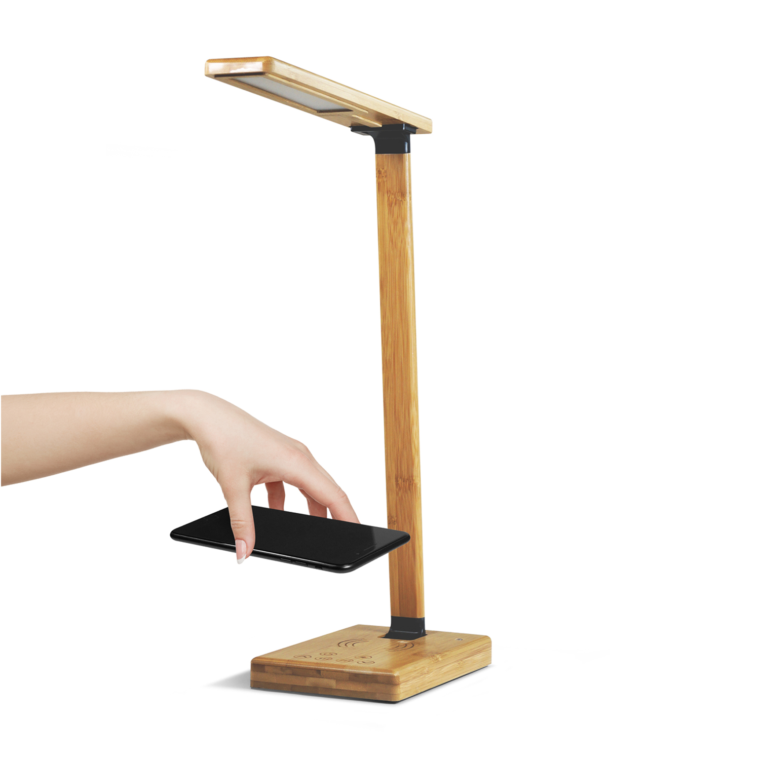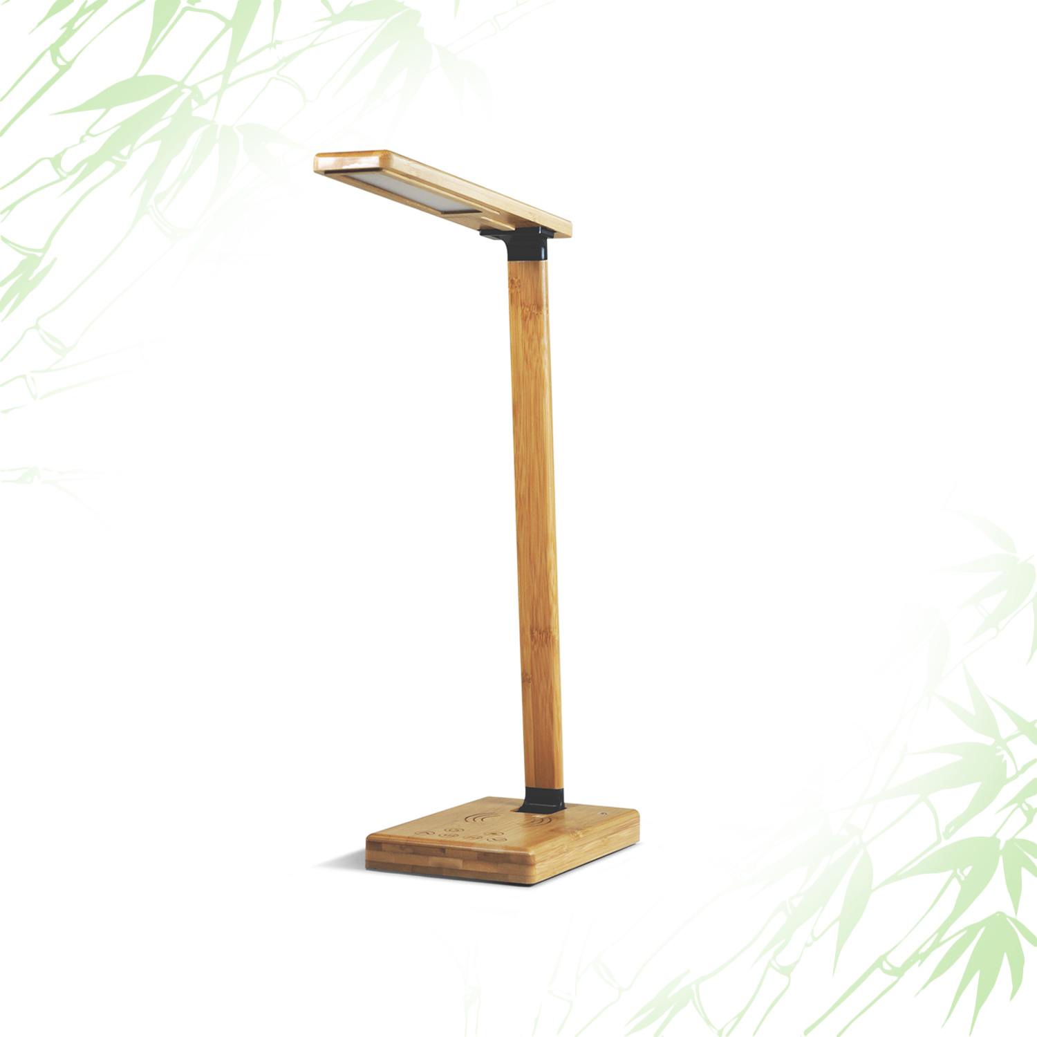 Lampada da tavolo in bamboo con LED e supporto di ricarica wireless a induzione 1A. Funziona con telefoni compatibili o tramite adattatori ACC1738i / ACC1738M.