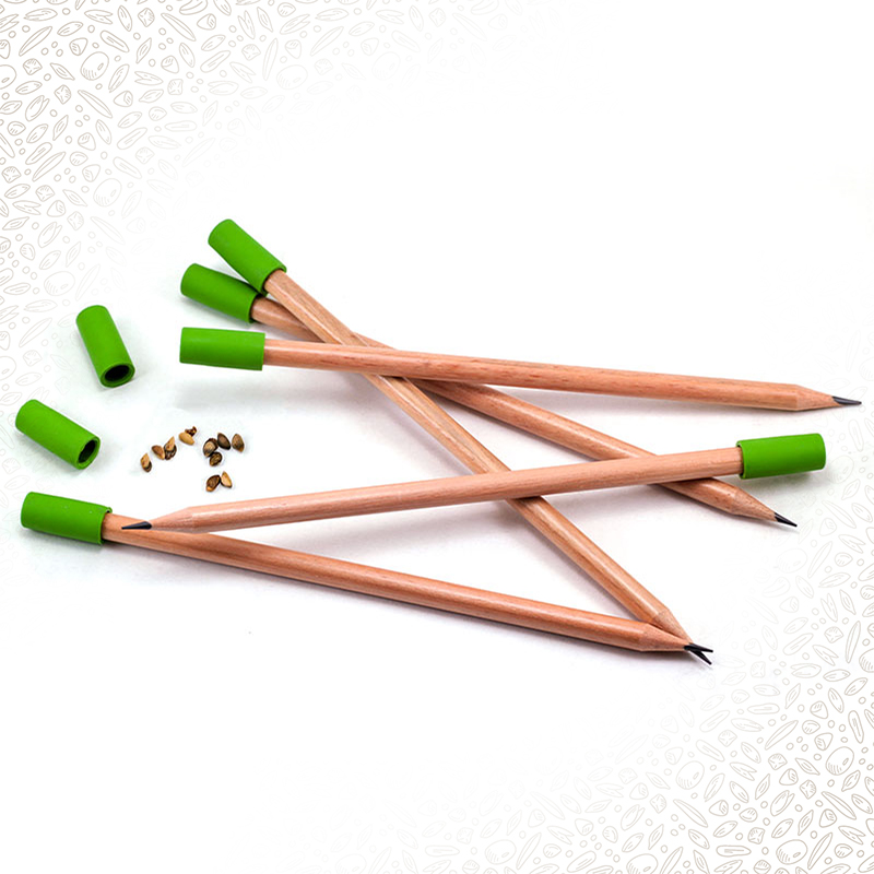 Matita con gomma nella parte superiore: una volta tolta la gomma si trovano dei semi. I semi si possono piantare e far nascere fiori o erbe a vostra scelta. La gomma è realizzata in bioplastica che impiega circa 1-3 anni per degradarsi in natura.