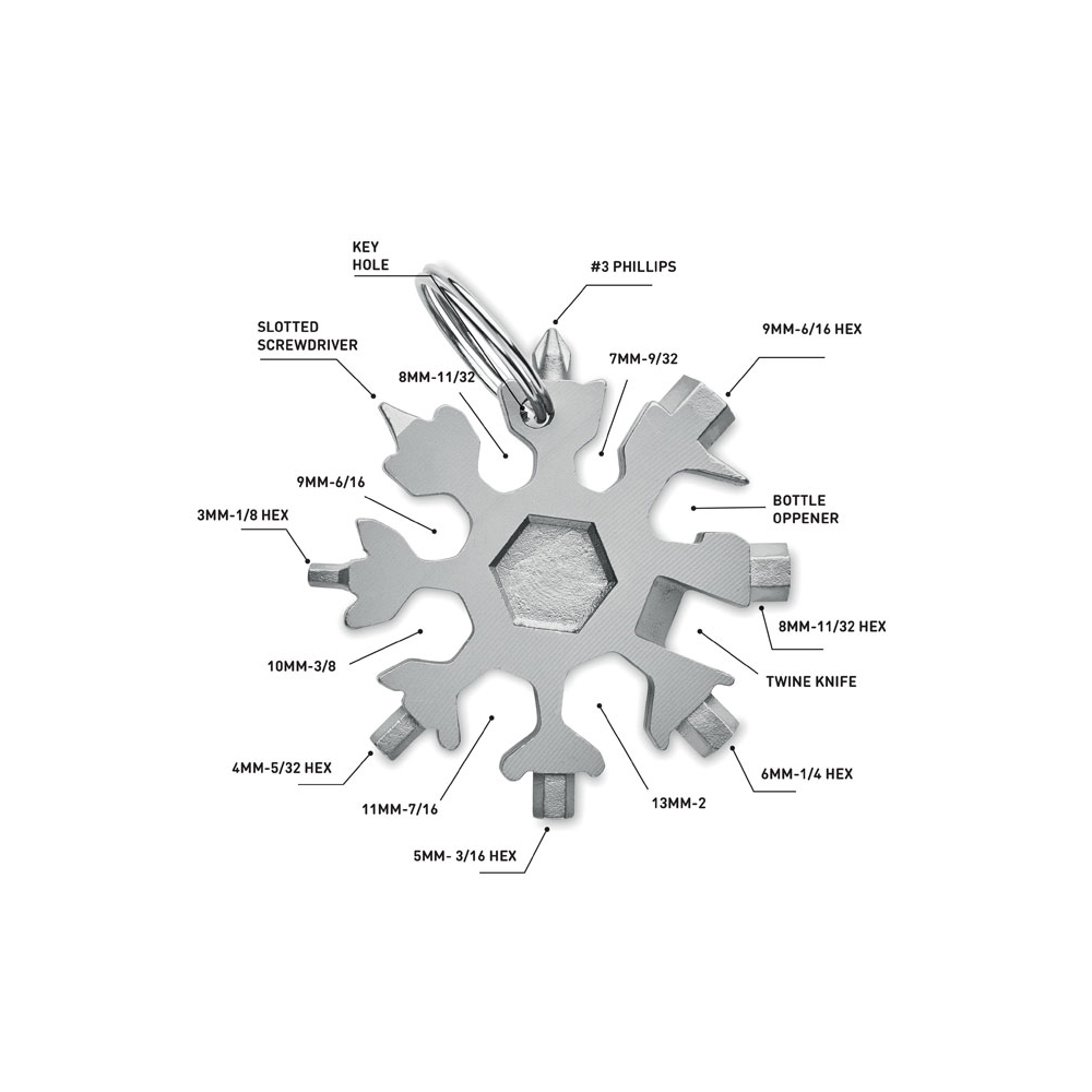 Multiattrezzo 17-in-1 in acciaio inossidabile a forma di fiocco di neve. Anellodi metallo opzionale incluso. Questo multiattrezzo è perfetto per progetti dibricolage e tuttofare. L’anello permette di attaccarlo alla cintura degliattrezzi o ad altri supporti.