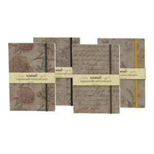 Notebook in Ecovinx. L’Ecovinx è realizzato con cellulosa composta da fibre provenienti da scarti di lavorazione con certificazione FSC. L’effetto invecchiato e stropicciato della carta-tessuto è derivato da un particolare trattamento conciario. Ecovinx è il materiale con cui si realizzano le etichette dei jeans, è lavabile e resistente agli strappi e all’usura.