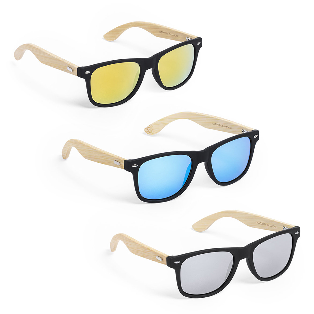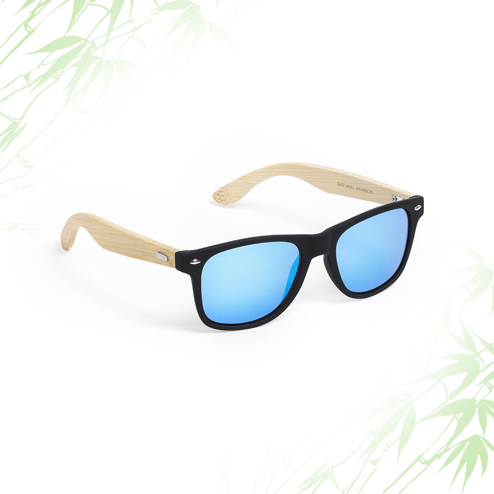 Occhiali da sole con protezione UV400. Telaio nero in materiale PC resistente e stecche in bamboo. Lenti AC (acetato di cellulosa) con finitura a specchio, disponibili in un’ampia gamma di colori. Confezionati singolarmente in un’attraente scatola dal design ecologico.