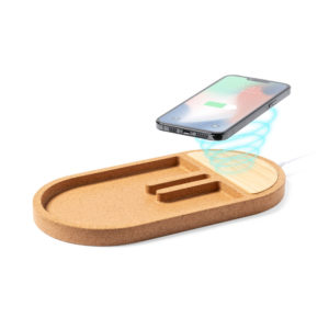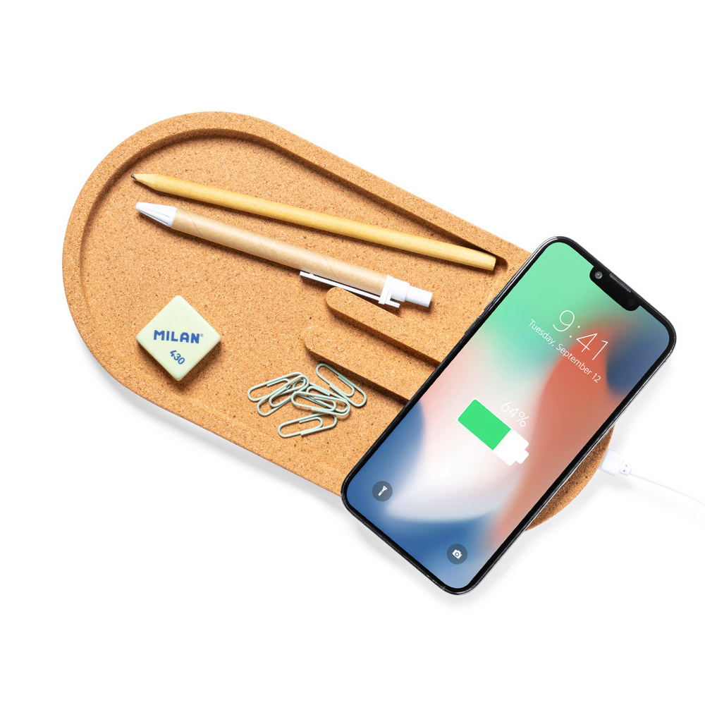 Organizer da scrivania fatto in sughero e bamboo, con una parte per portacellulare e oggetti da scrivania e una parte caricatore wireless da 10W