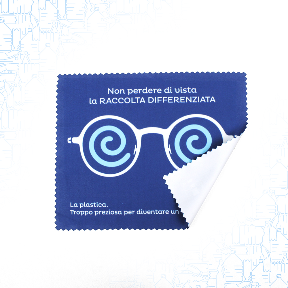 Panno per occhiali in microfibra rpet 180gr/mq, personalizzato in sublimazione. Formato 15x18cm, stampa su un lato o entrambi. La confezione è una bustina singola biodegradabile. Made in italy, atossico