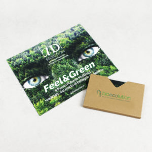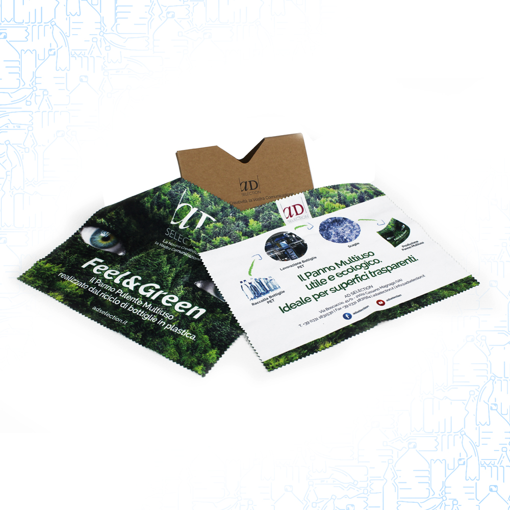 Panno multiuso in microfibra di alta qualità (250gsm) realizzato in PET riciclato personalizzato con stampa full color su un lato.