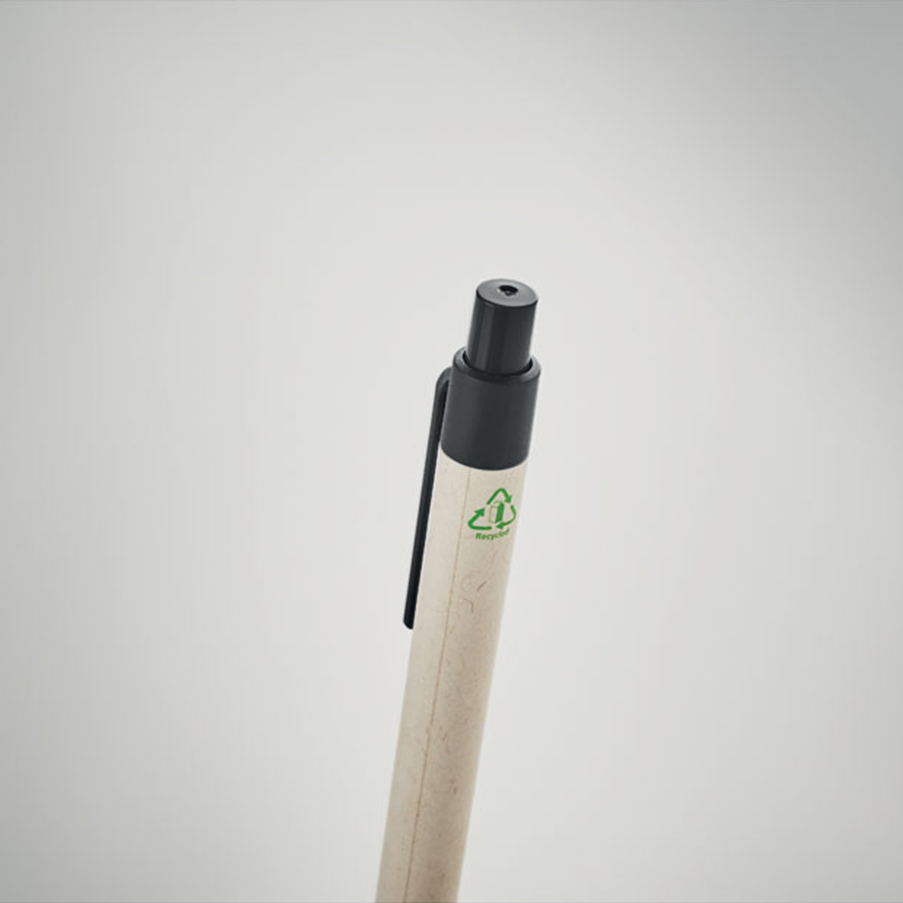 Penna a sfera a pulsante con fusto in cartone riciclato del latte (70%) e parti in PLA (in mais biodegradabile al 100%). Inchiostro blu.