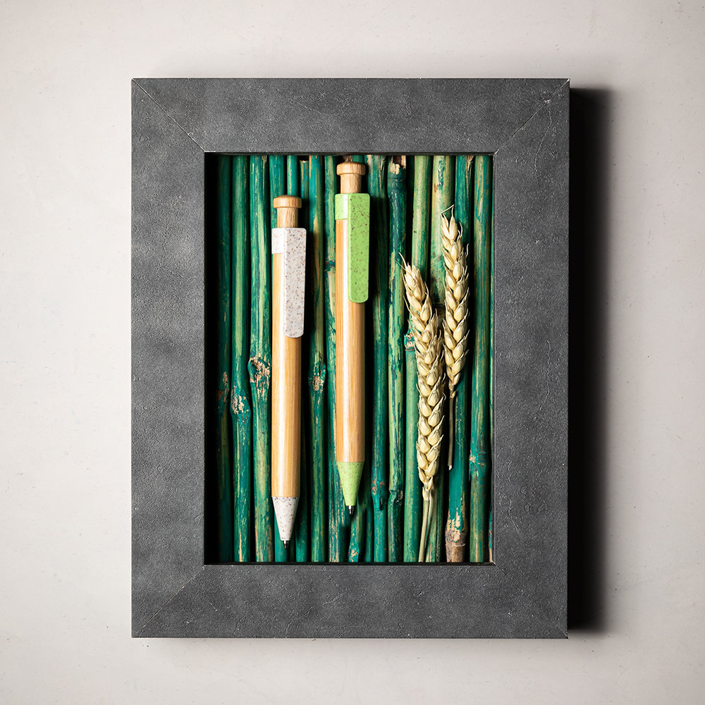 Penna in bamboo, clip e punta in fibra di grano, per incoraggiare l’uso di materie prime naturali e ridurre le emissioni inquinanti. Meccanismo a pulsante e refill blu.