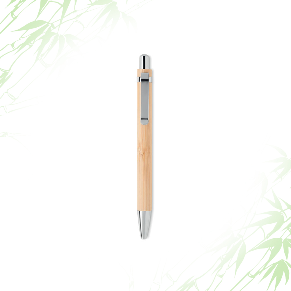 Penna a pulsante senza inchiostro di lunga durata con fusto in bamboo e finiture cromate lucide. Questa penna ha una punta in lega metallica che, scrivendo, ossida la superficie della carta senza lasciare residui.