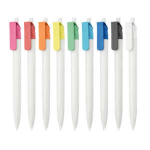 Penna a sfera a scatto realizzata in materiale riciclato proveniente dal recupero dei contenitori per bevande come tetrapak e similari. Fusto colore bianco/grigio e clip colorata. Refill ink. blu o nero.