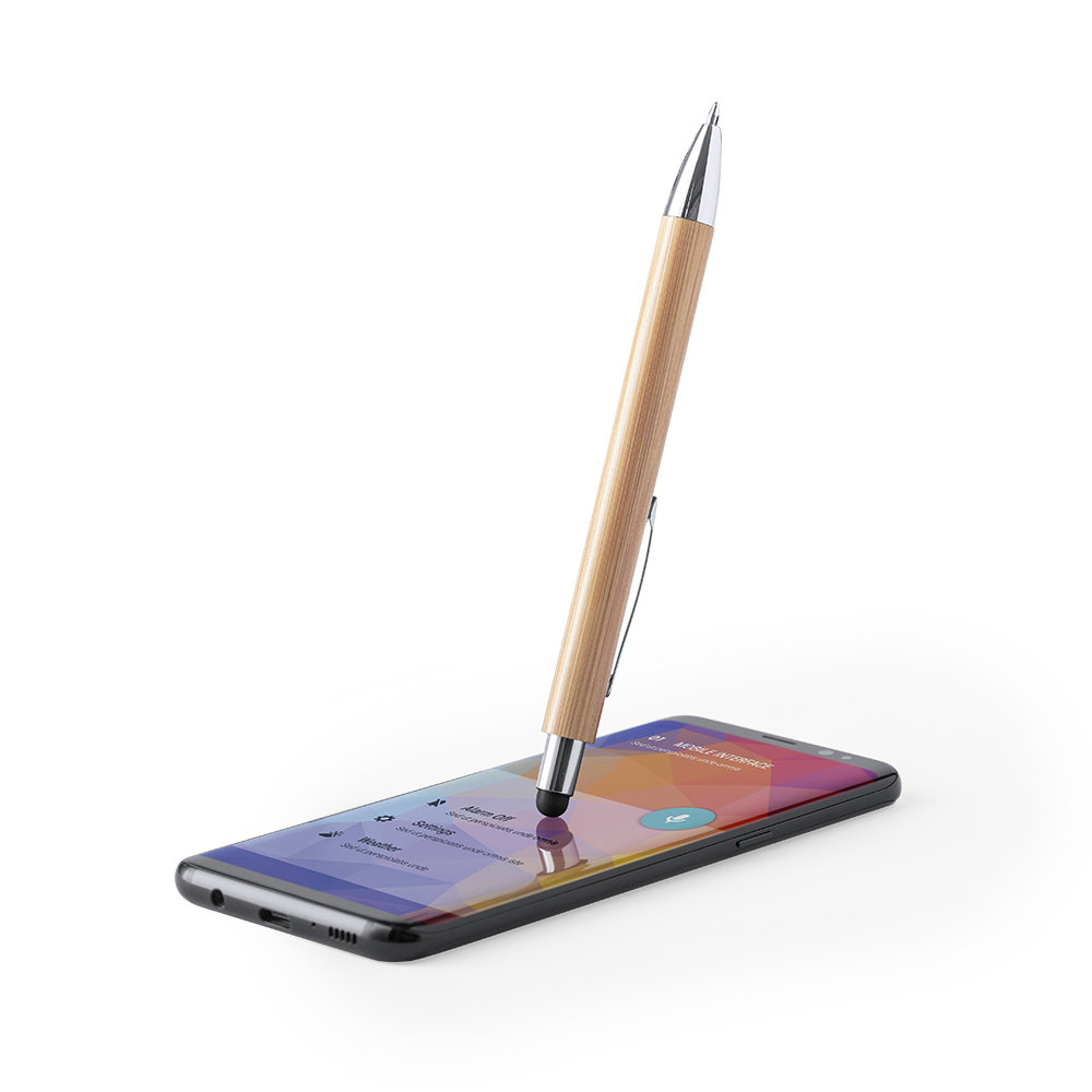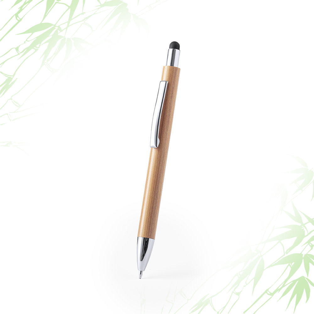Penna con corpo in bamboo e accessori cromati, con puntatore nero per i vostri dispositivi elettronici. Meccanismo a pulsante, clip metallica e cartuccia jumbo con refill blu.