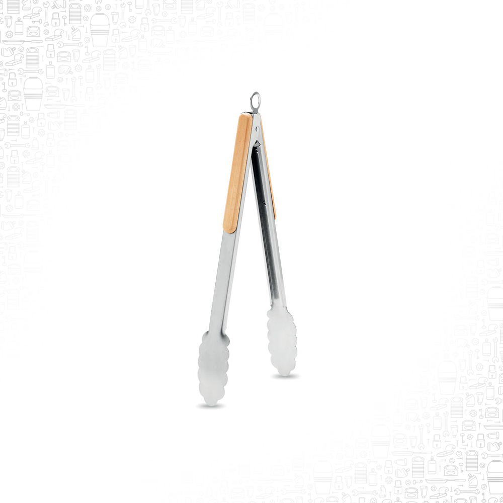 Pinze da barbecue in acciaio inox con impugnature in bamboo. Meccanismo di bloccaggio.