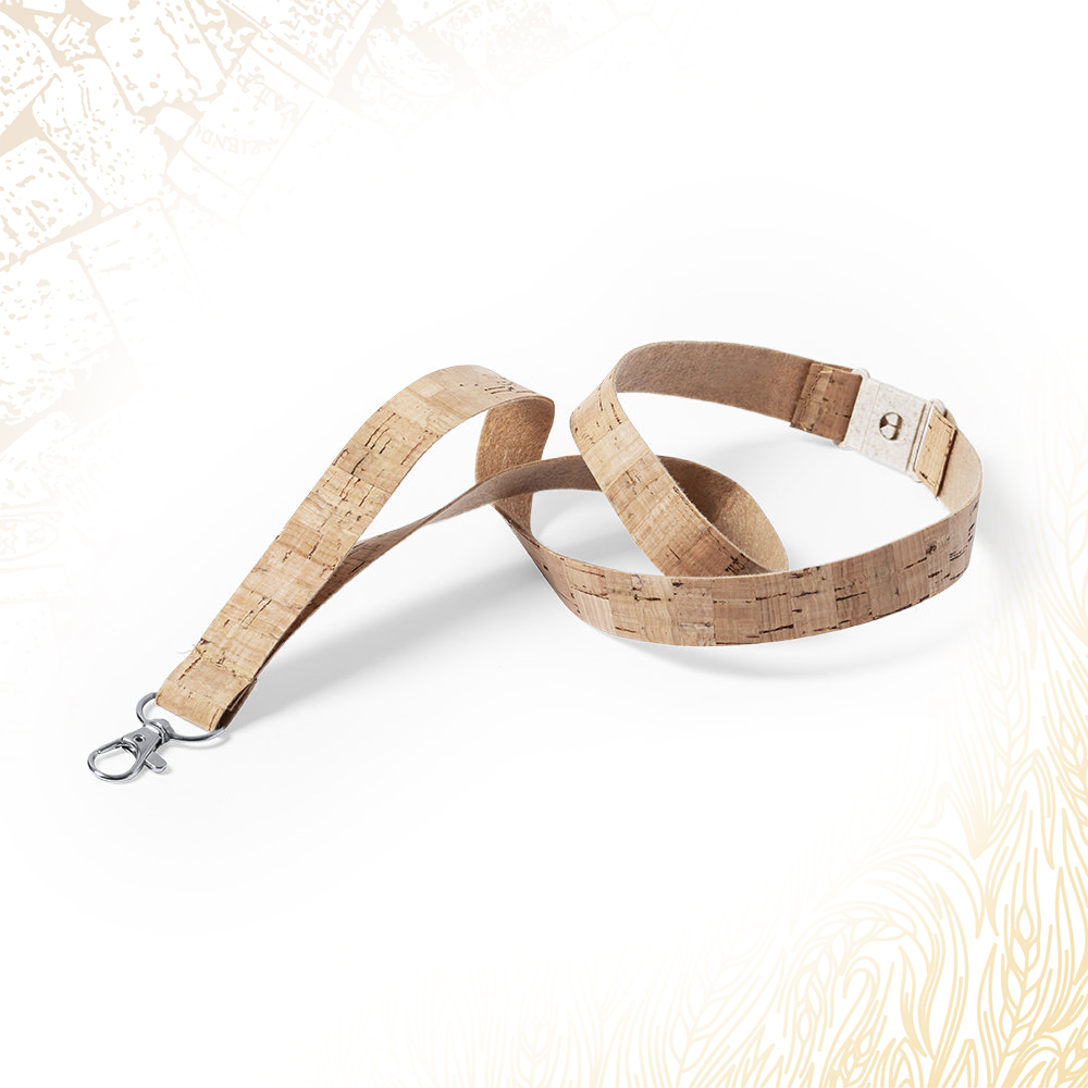 Lanyard in sughero naturale. Chiusura di sicurezza sul collo in fibra di grano/PP, al fine di promuovere l’utilizzo di materie prime naturali e ridurre le emissioni inquinanti.