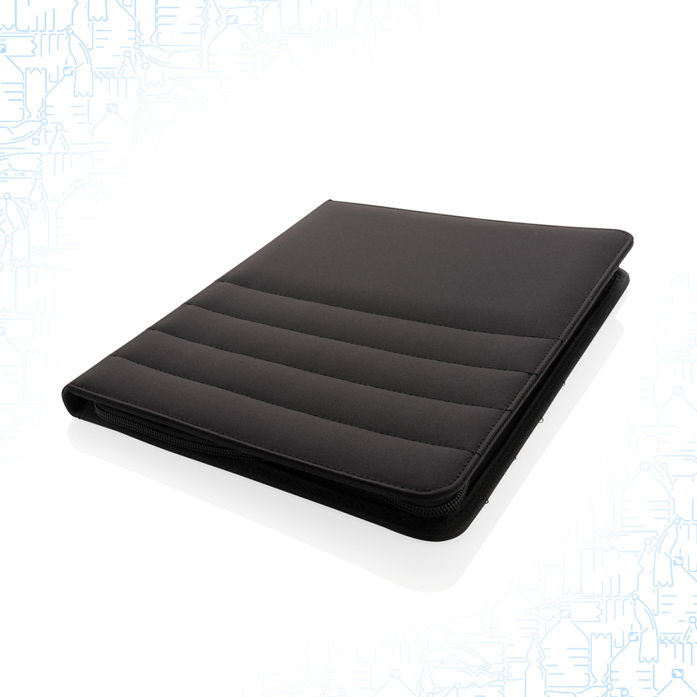 Portablocco e documenti A4 Aware T RPET, con cerniera. Al suo interno, trovi 1 tasca capiente, 1 taschino per il telefono, 4 card slots e un passante per penna. Fornito di un taccuino di carta riciclata con 20 fogli a righe in color crema e grammatura 80gr/m2. Interno ed esterno in poliestere riciclato 100% aware T.