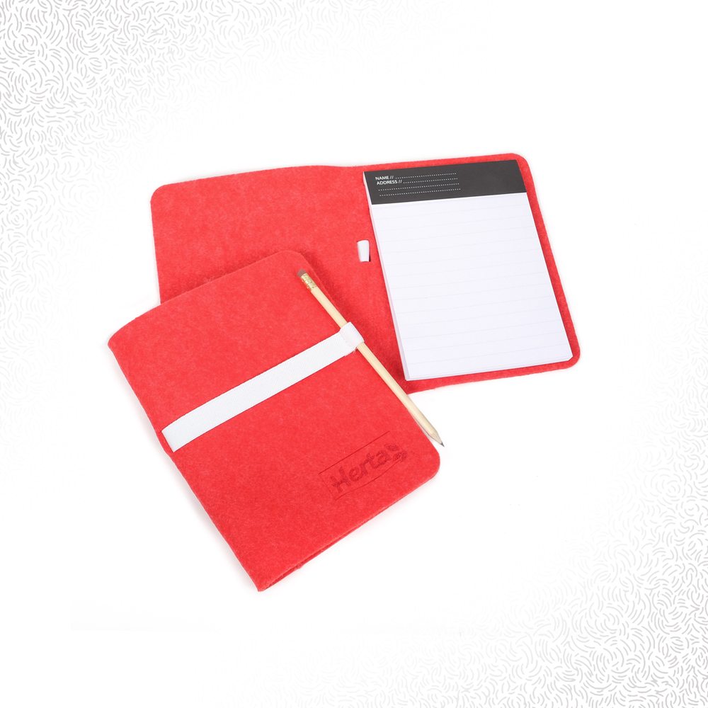 Portadocumenti in feltro formato A5 com matita inclusa. Chiusura con laccio e anello portamatita