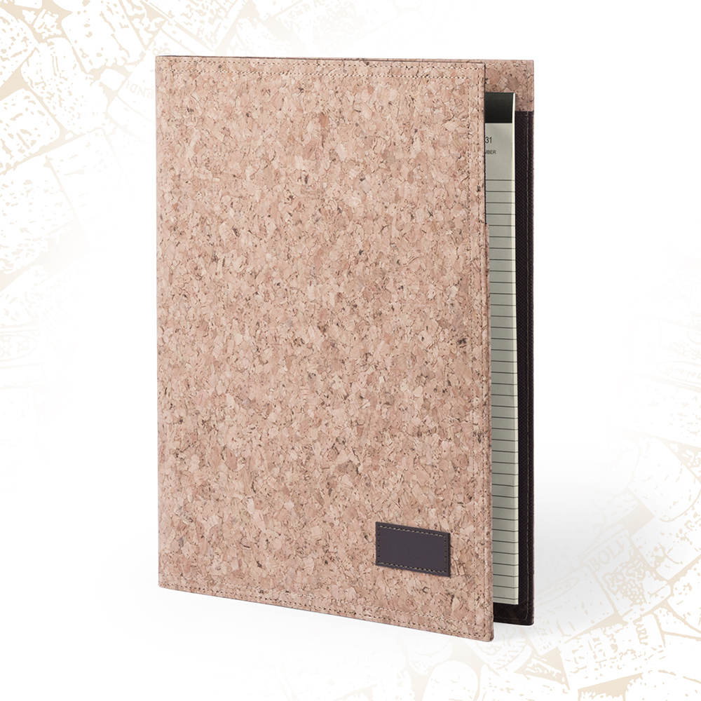 Porta documenti con elegante rivestimento soft touch in sughero naturale e interno in morbida pelle PU. Dotato di bloc notes con 20 fogli e portapenne.